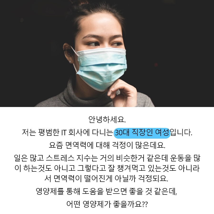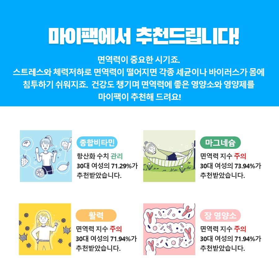 요즘 면역력이 중요한 시기죠. 면역력이 떨어지면 각종 세균이나 바이러스가 몸에 침투하여 염증과 여러 병을 일으킬 수 있습니다. 면역력에 좋은 영양제를 마이팩이 골라줄게요!