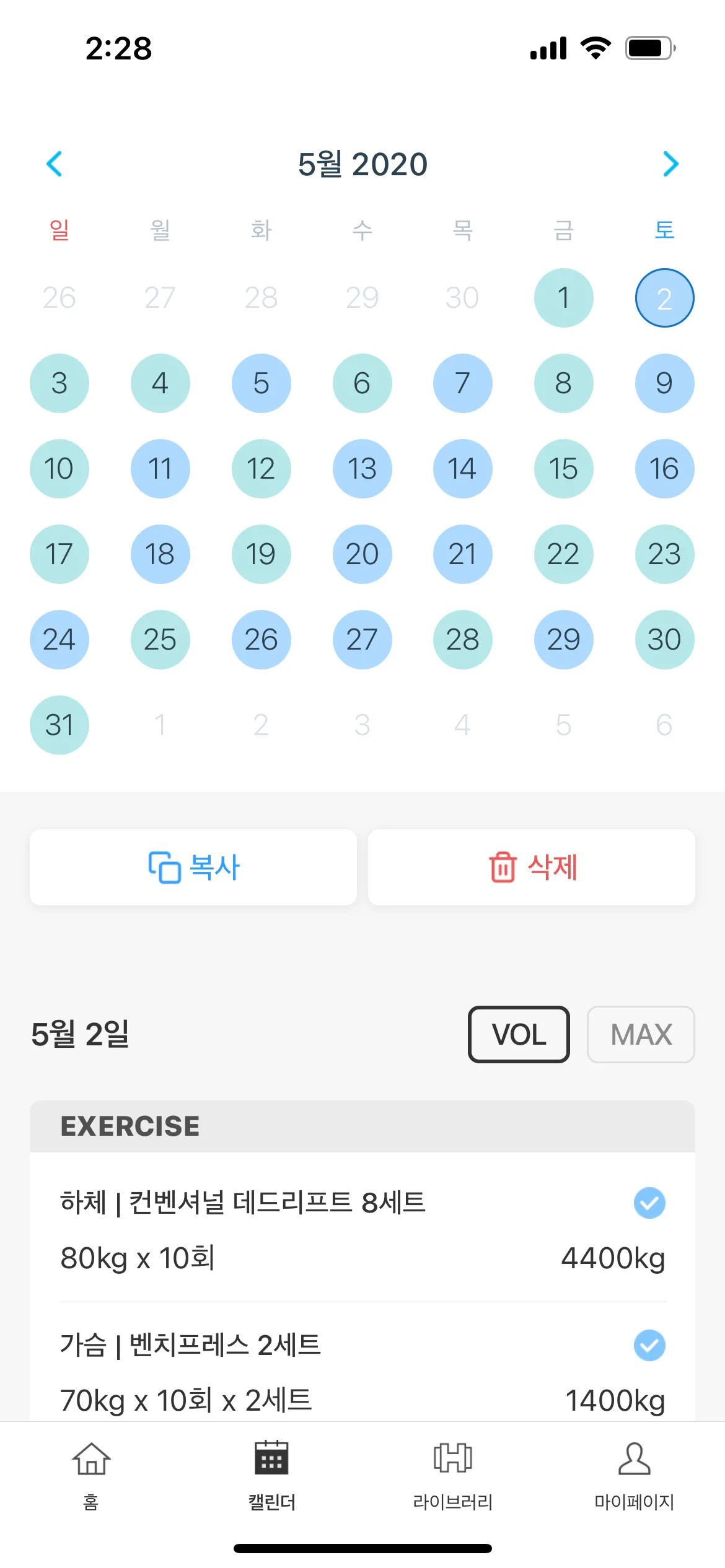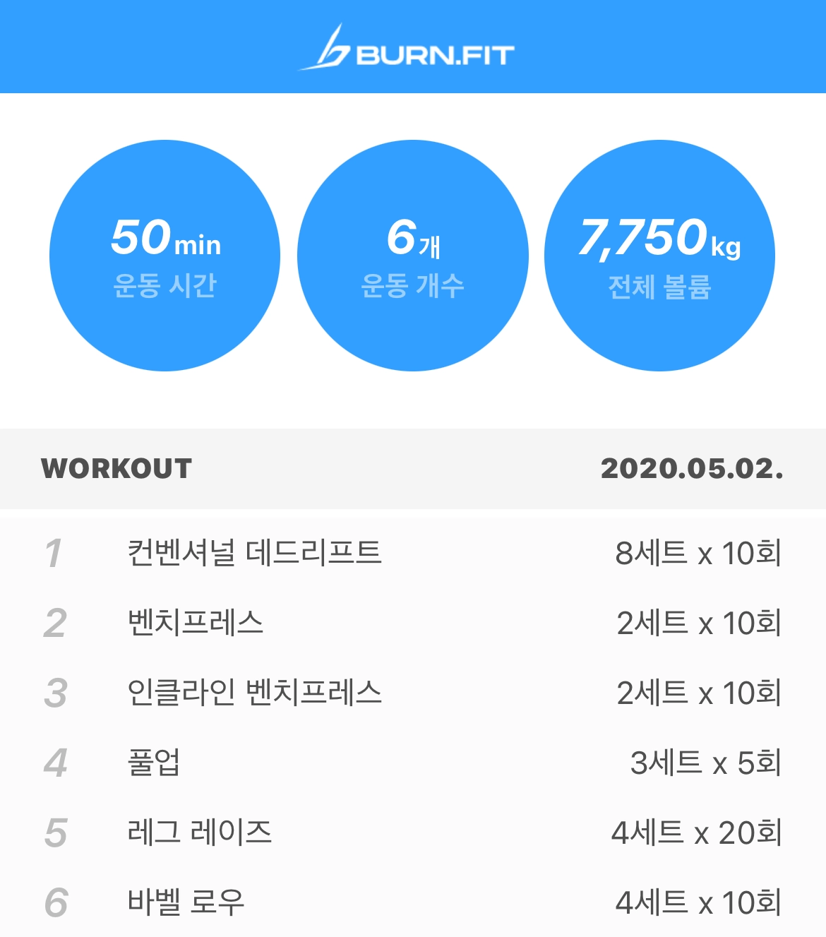 번핏을 처음 이용했던 날짜의 운동일지 스크린샷 캡쳐