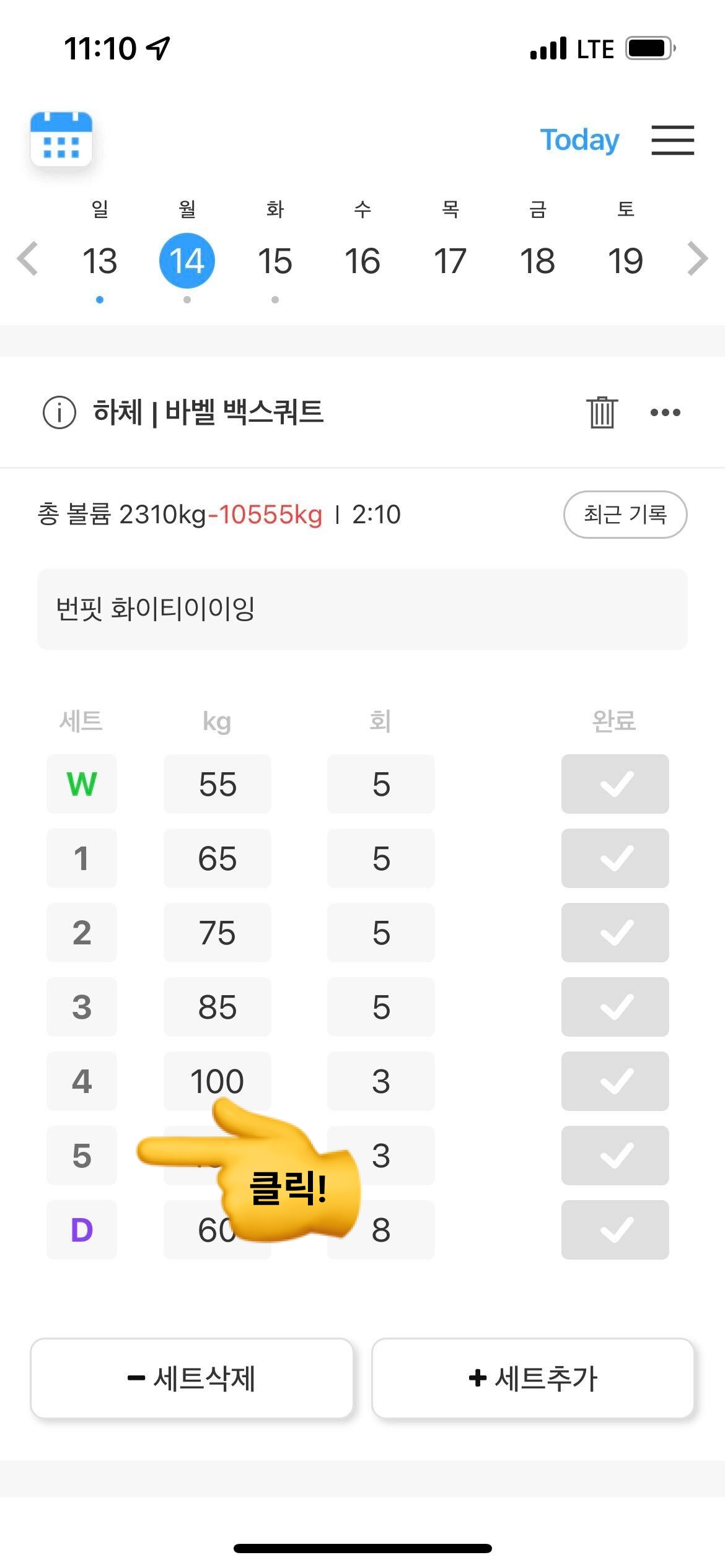 기록 페이지에서 바벨 서포터를 사용하고자 하는 세트의 세트 번호를 클릭합니다.