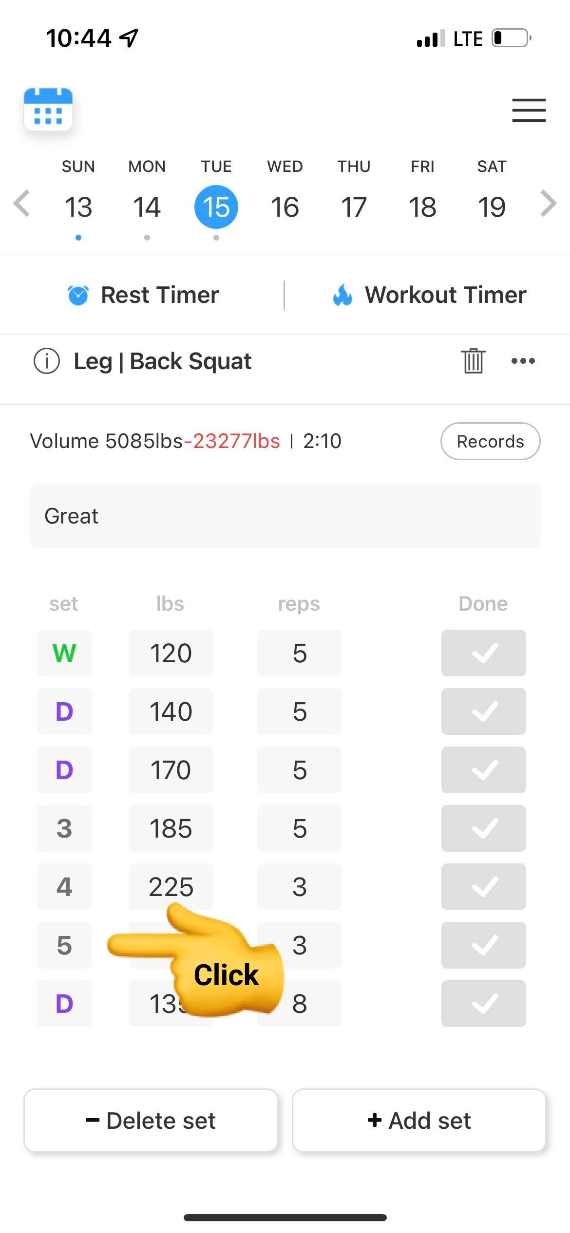 At the workout plan page, click on the set number of the set you wish to use barbell supporter