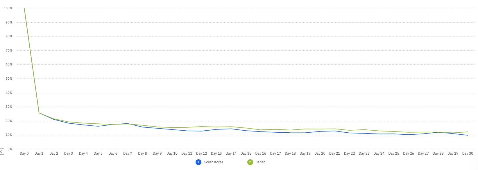 일본 - MAU 1.3만명 / 핵심유저 비율 31% / 월간구독 성장률 245% / Stickness 22% / 21일 리텐션 21.0%