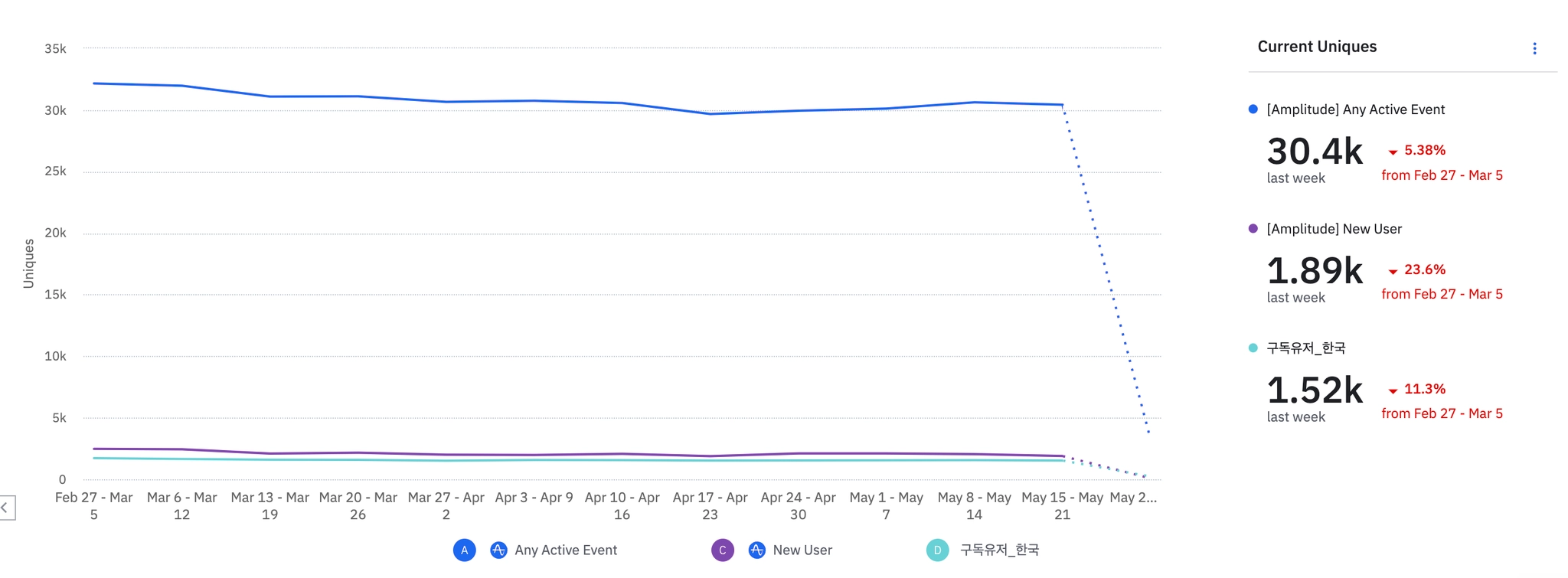 한국 - MAU 5.4만명 / 핵심유저 비율 43% / 연간구독 성장률 225% / Stickness 27% / 21일 리텐션 21.7%