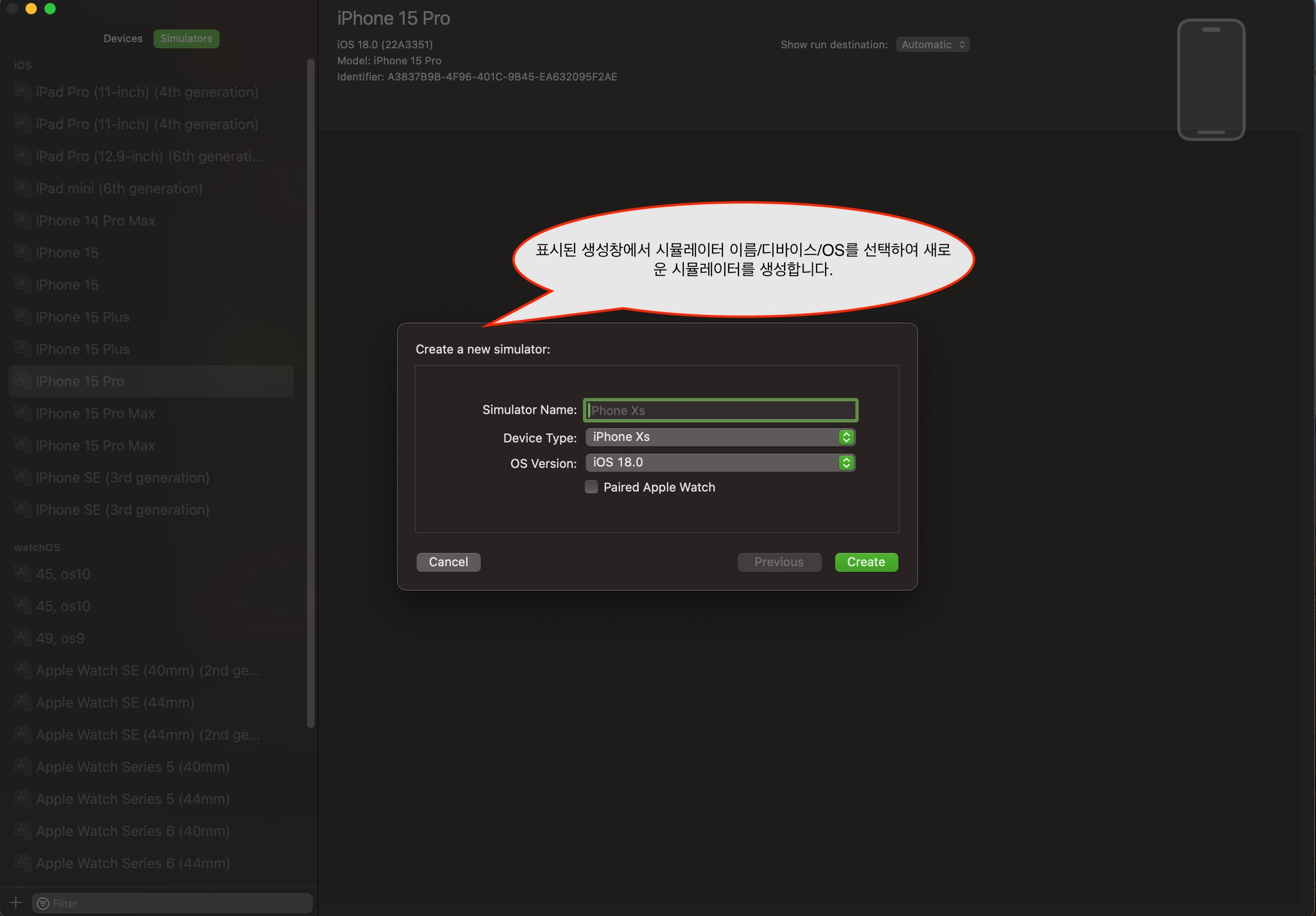 실행된 생성창에서 시뮬레이터 이름/디바이스 종류/OS버전을 선택해 원하는 시뮬레이터를 생성합니다.