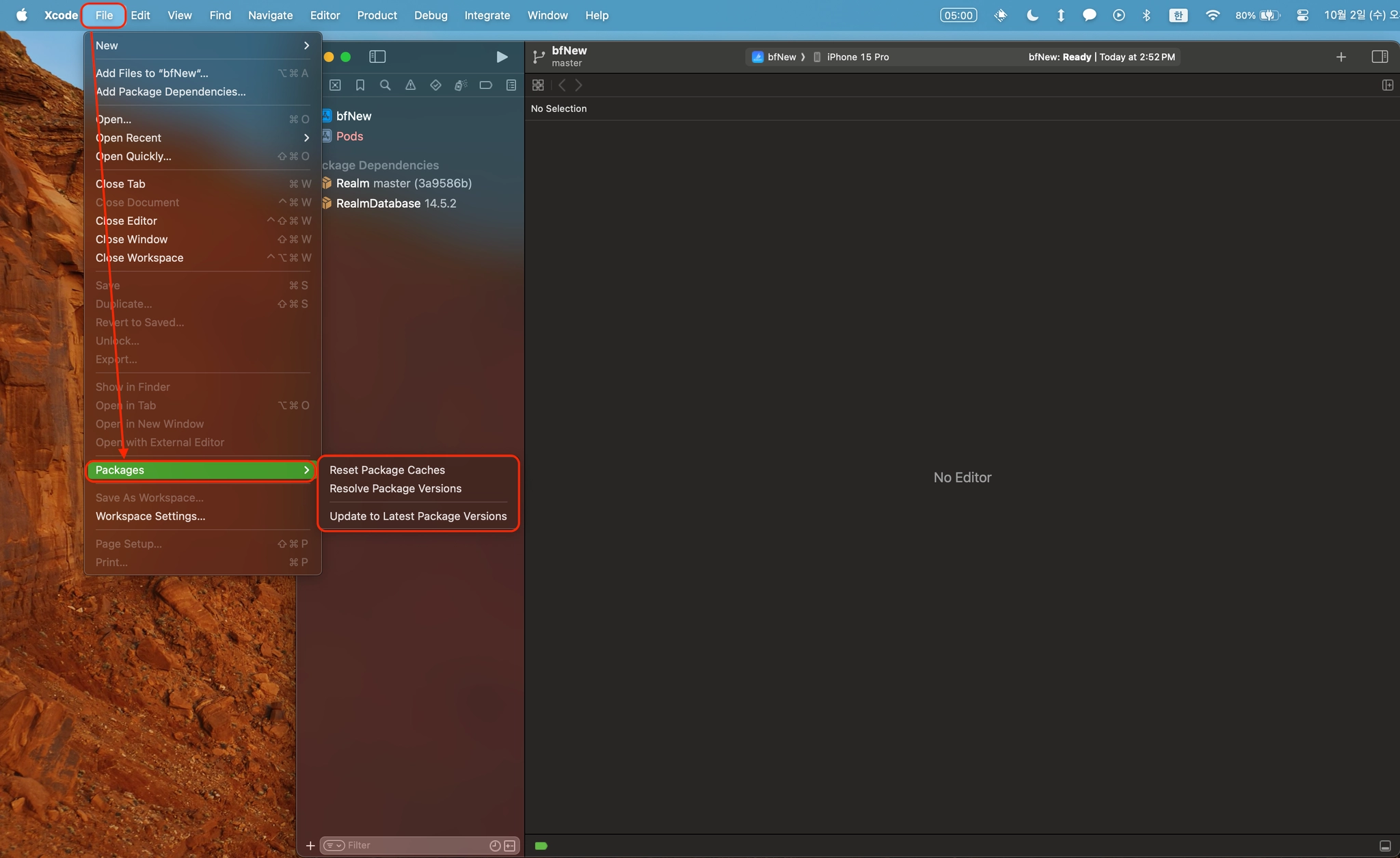 Xcode가 실행된 상태에서, 상단 상태 bar의 File 항목 내의 Packages 에 들어가면 다음 세 가지 옵션이 있습니다. 필요에 따라 옵션을 선택해서 처리합니다.