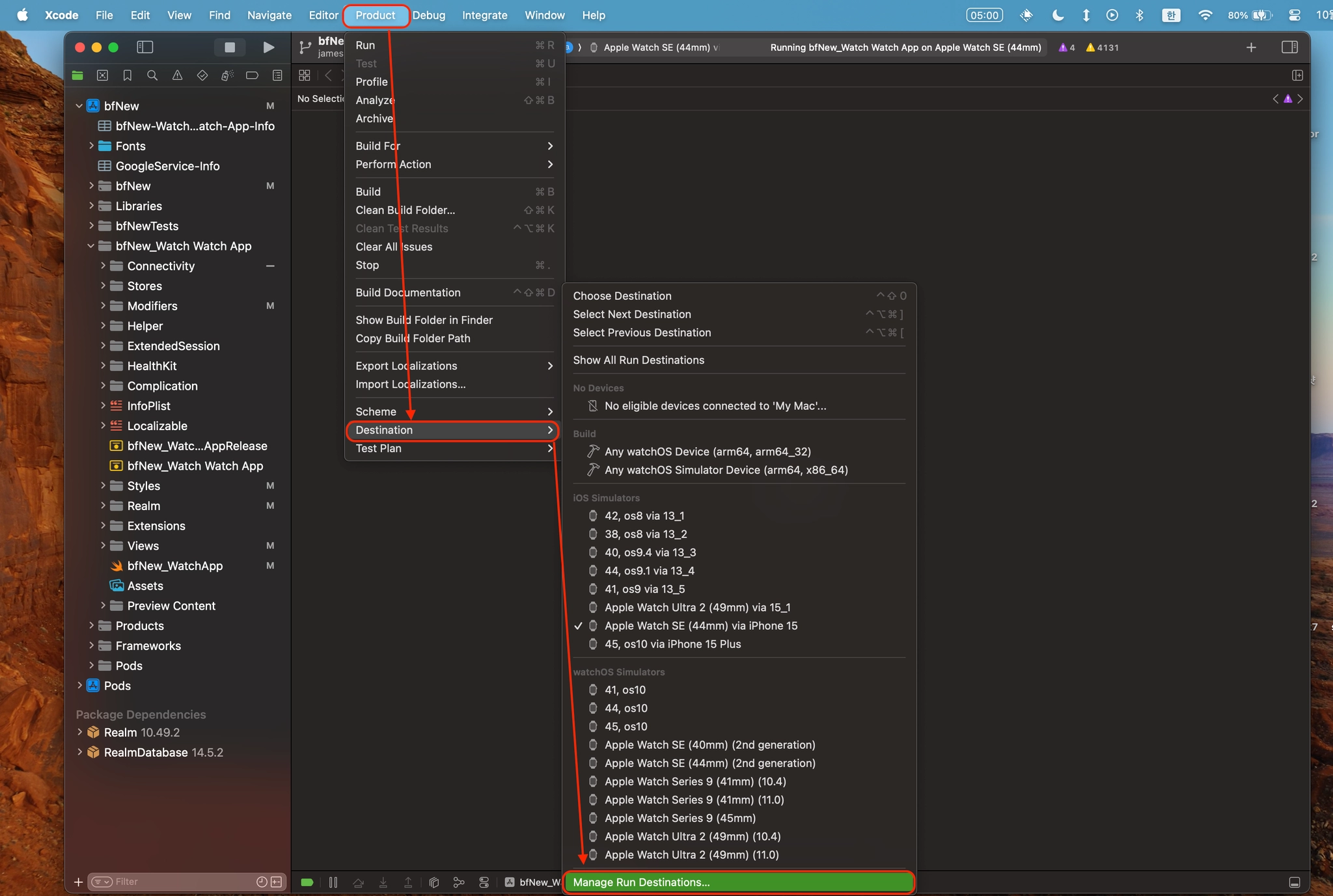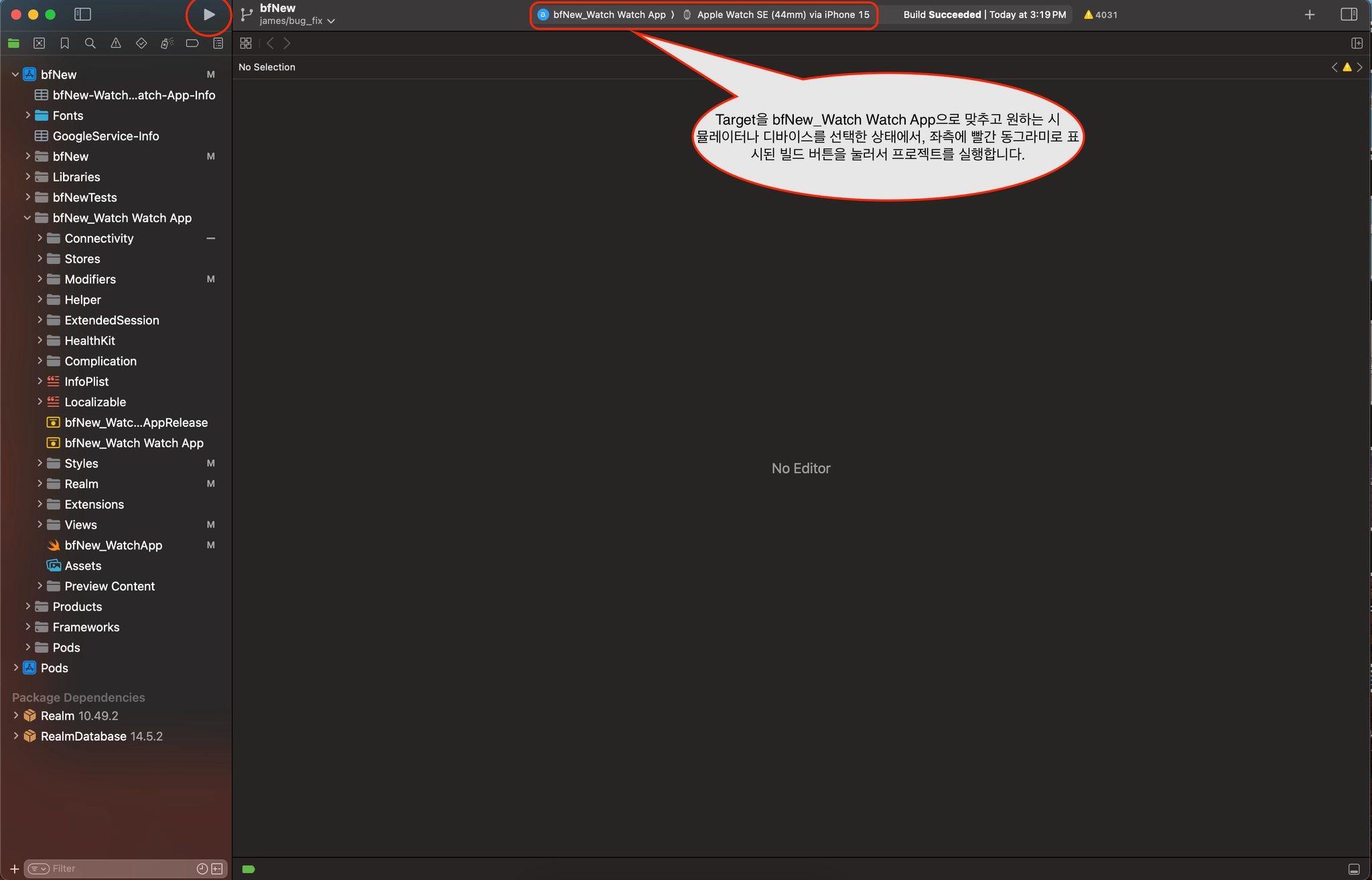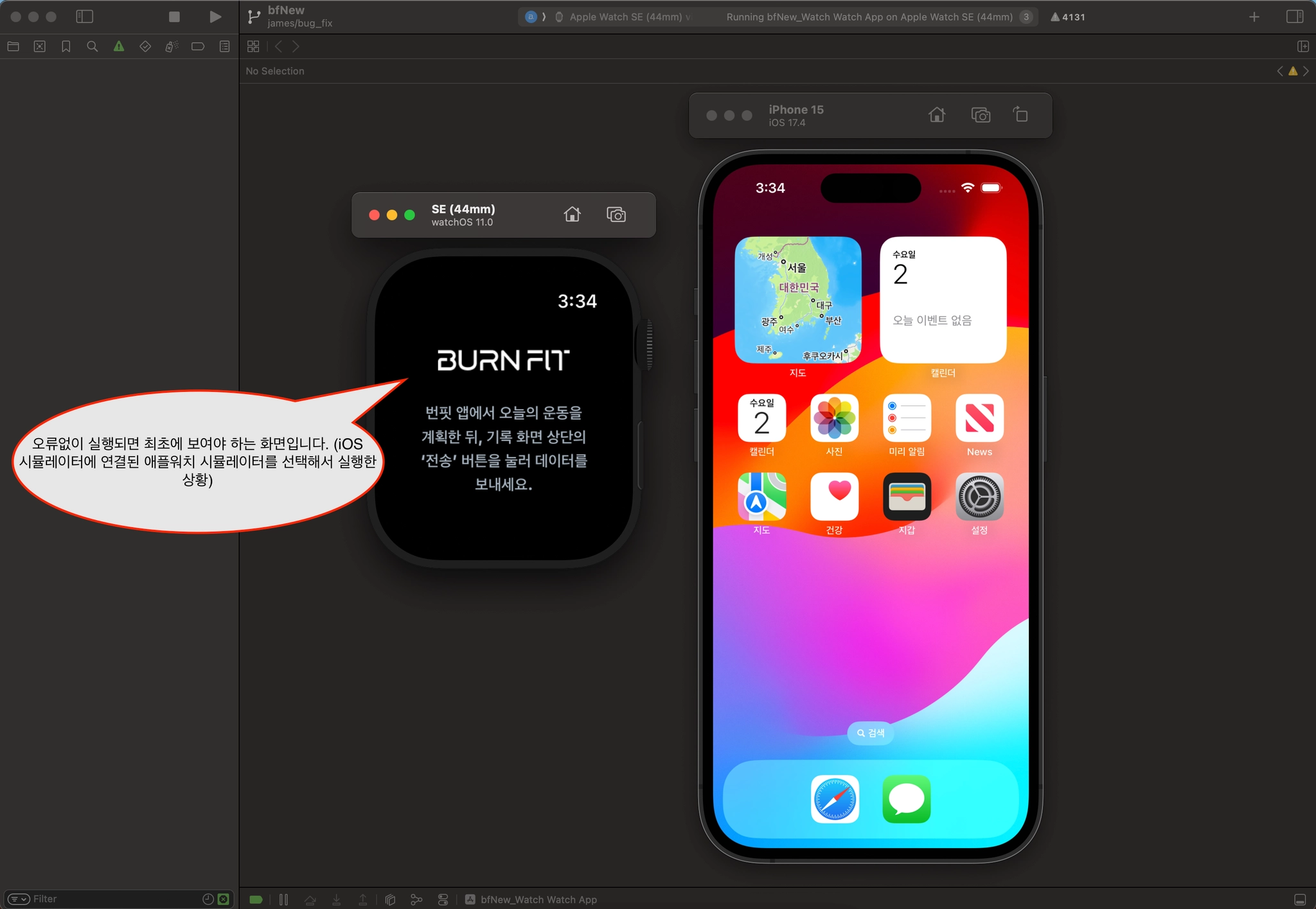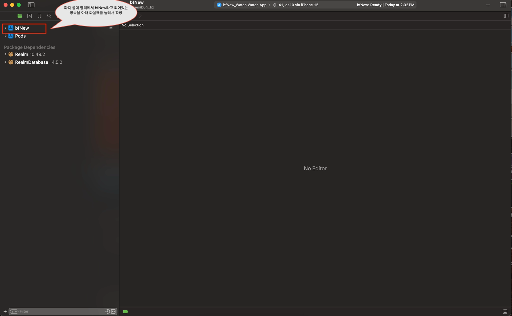 프로젝트 실행 시 Xcode 좌측 폴더 패널의 bfNew_Watch Watch App 폴더 내에 워치앱과 관련된 폴더 및 파일들이 위치해 있습니다.
