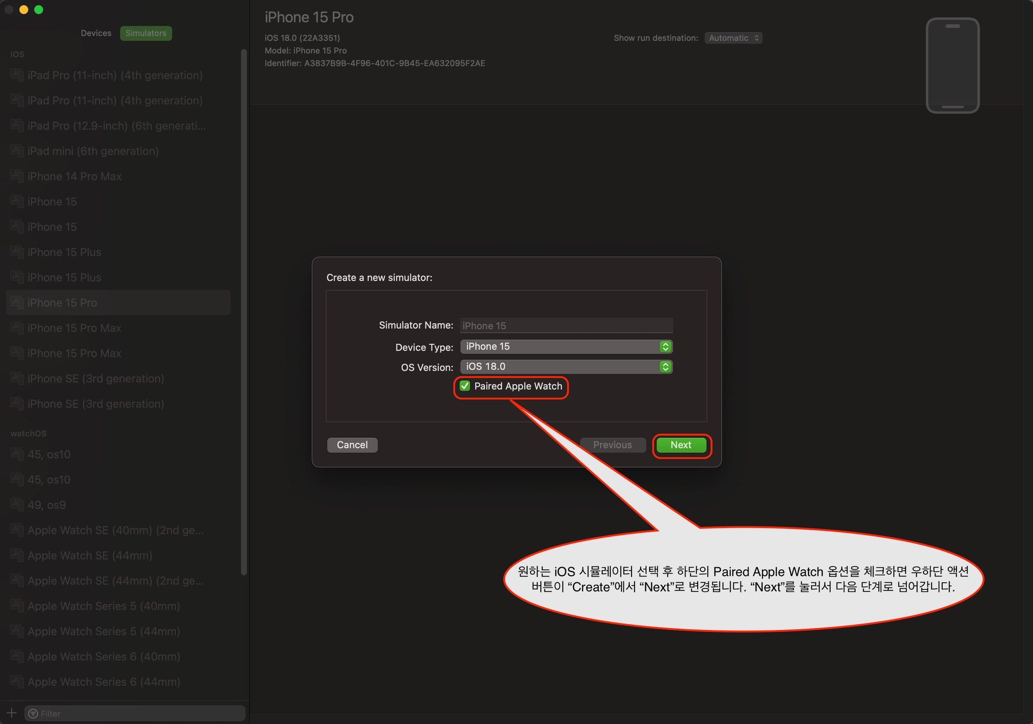 생성창에서 원하는 iOS 시뮬레이터를 선택한 후 하단의 Paired Apple Watch 항목을 체크하면 액션버튼이 Create 에서 Next 로 변경됩니다.