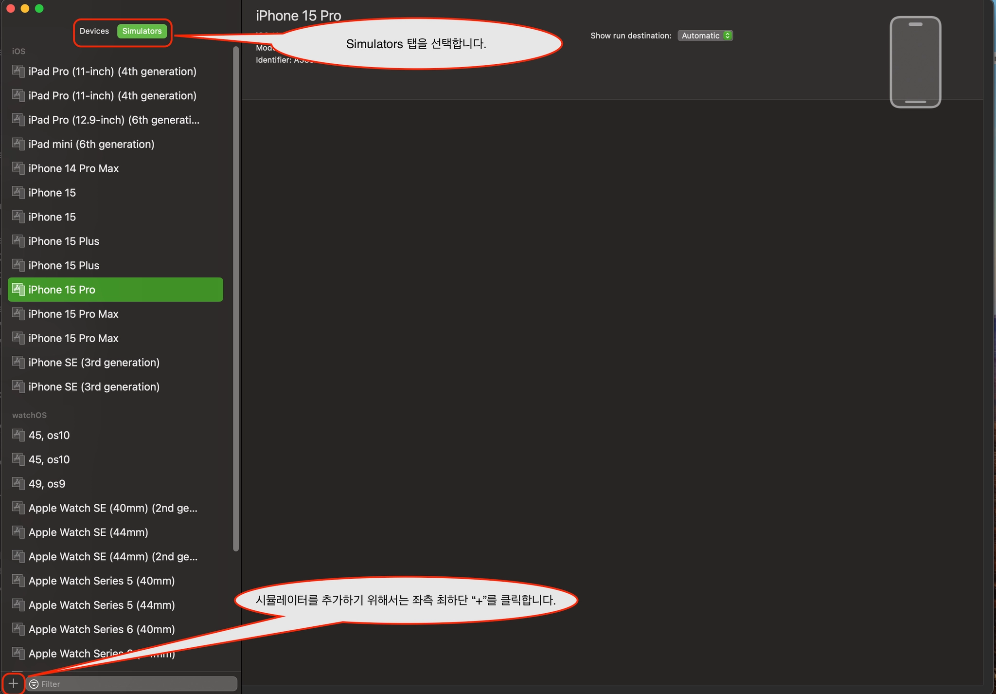 시뮬레이터를 추가/삭제하는 방법에 대한 가이드입니다.