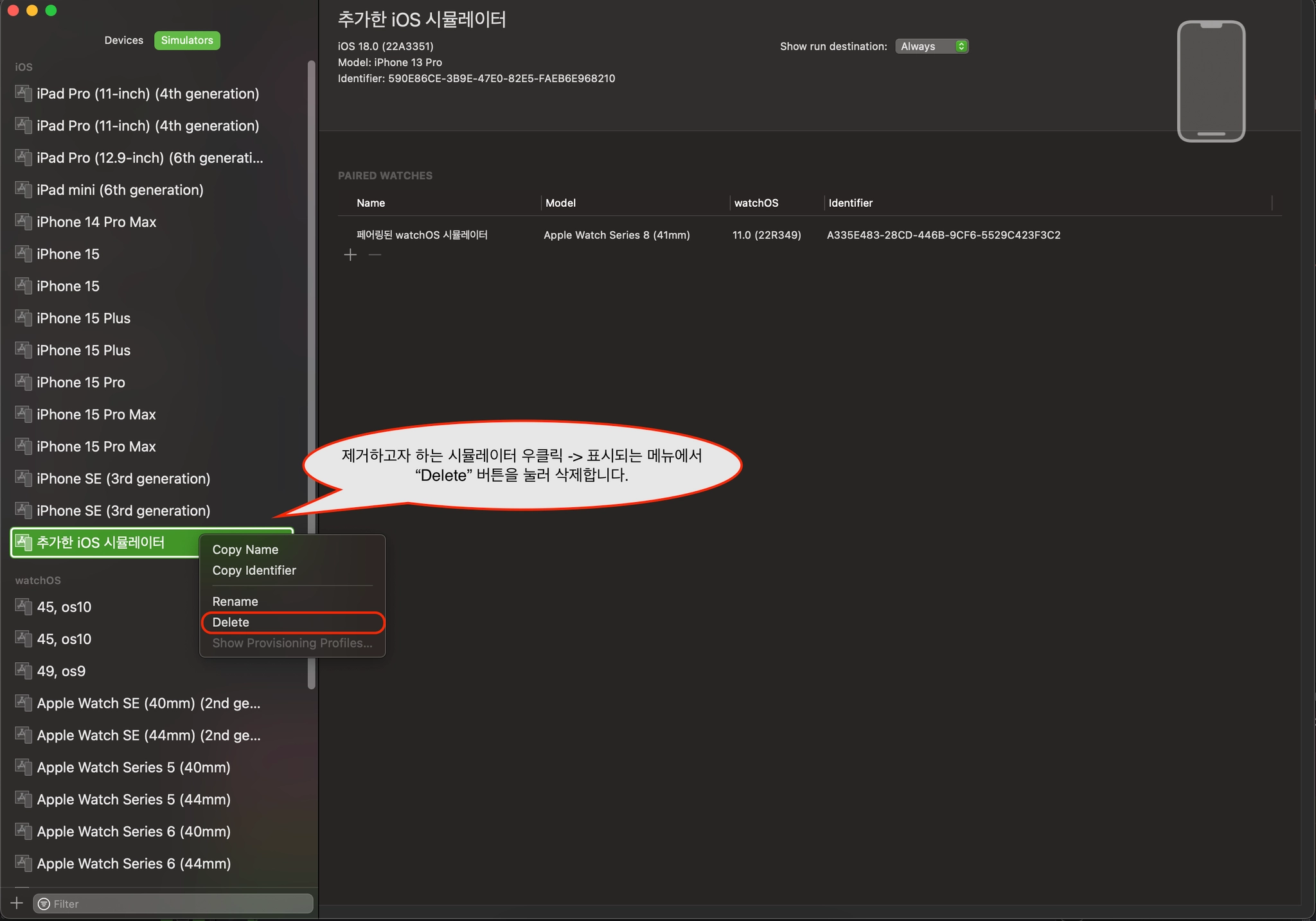 필요없는 시뮬레이터는 아래 방법으로 삭제합니다.