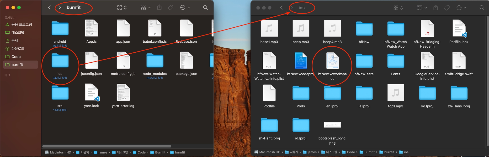 burnfit 폴더 내에서, ios 폴더 내에 위치한 bfNew.xcworkspace 파일을 실행하면 Xcode에서 프로젝트가 실행됩니다.