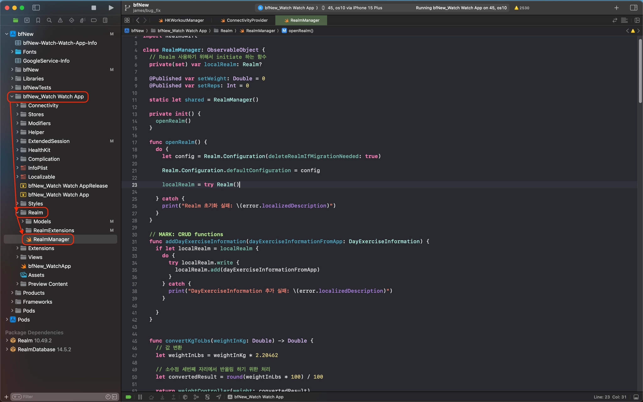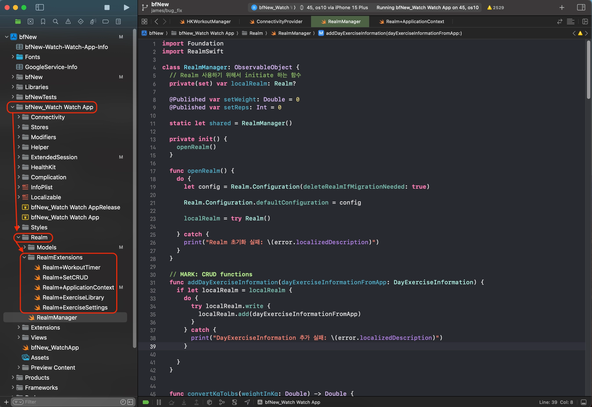 이 객체를 활용해서 앱 내의 주요 데이터인 운동 데이터가 Realm 저장 및 업데이트되고, 보존되었다가 최종적으로 다시 iOS앱으로 전송됩니다.