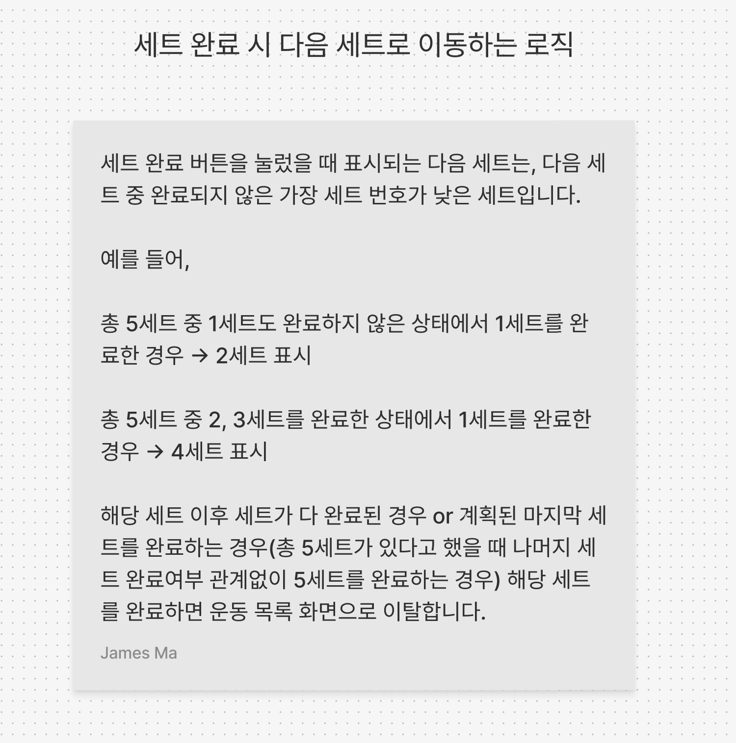 아래 자료는 운동 상세 화면에서 한 세트를 완료했을 때, 다음 세트로 몇 번째 세트가 표시되는지 직관적으로 이해하기 어려울 수 있을 듯 하여 준비한 자료입니다.