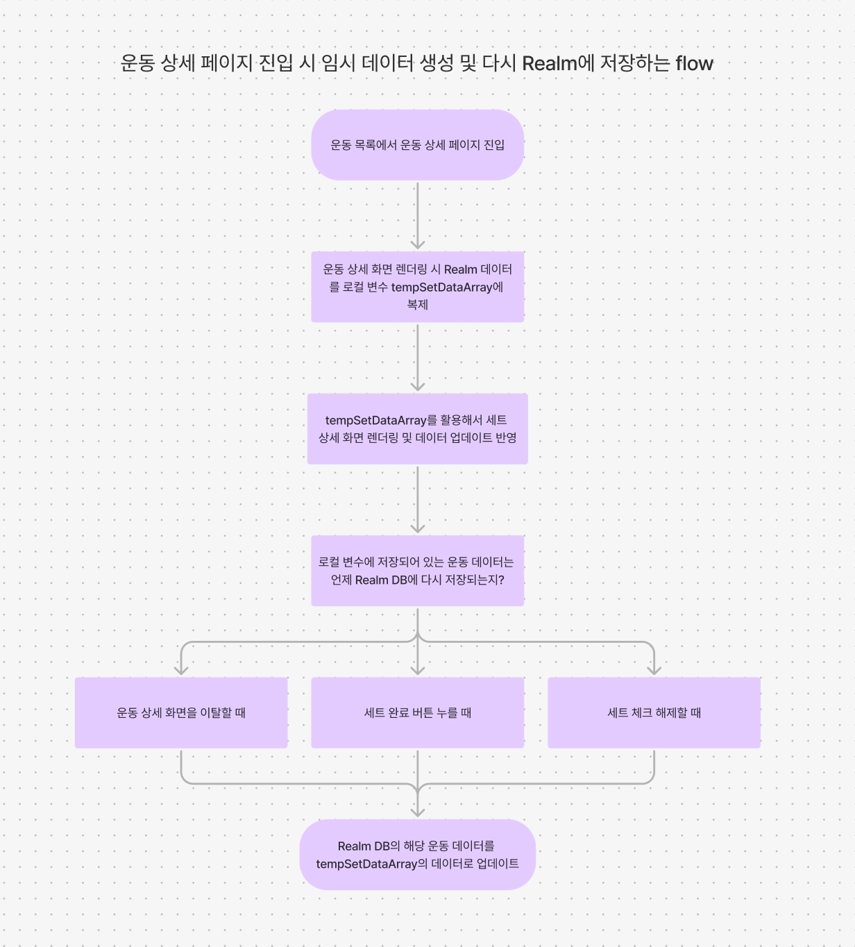 아래 자료는 운동 상세 페이지(SetDetailView)에서 왜 바로 Realm DB의 값을 사용하지 않고 별도의 로컬변수인 tempSetDataArray 를 선언해서 데이터를 복사해서 사용하는지에 대한 히스토리 설명이 필요할 듯 하여 준비한 자료입니다.