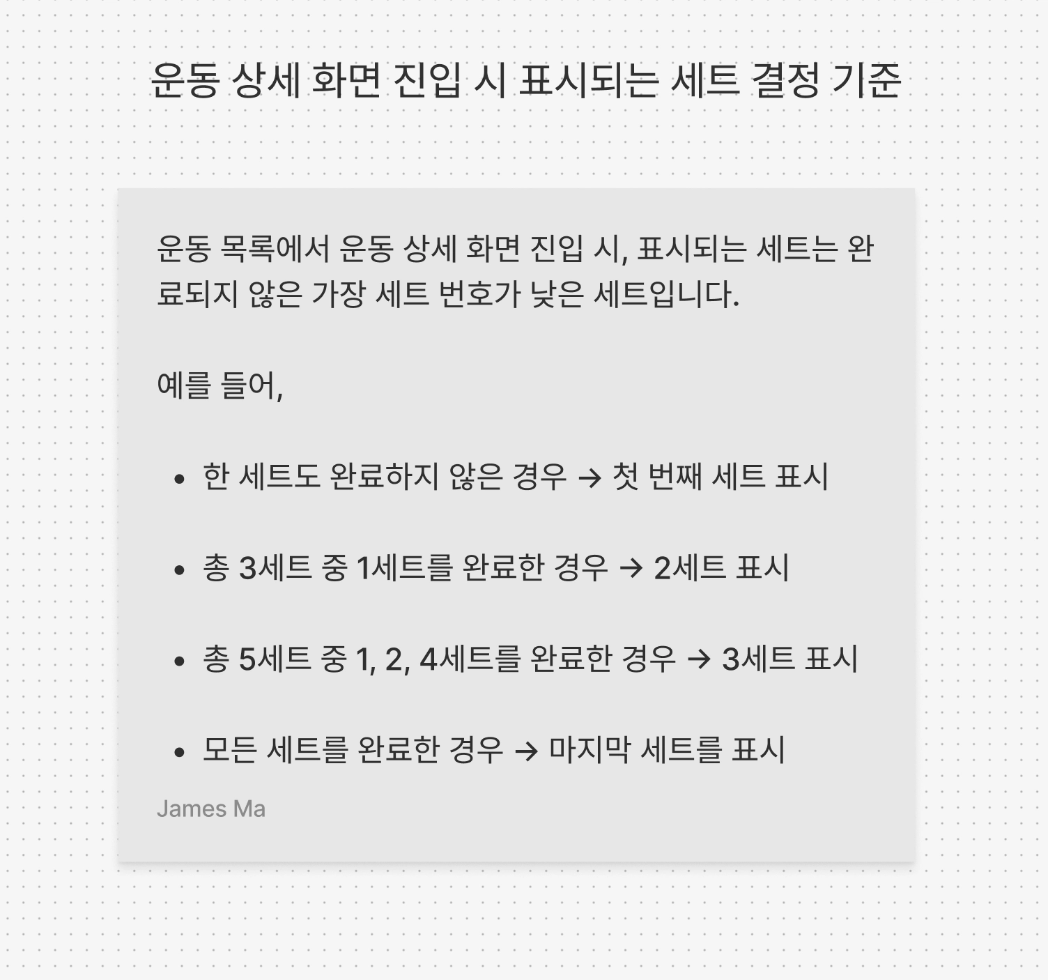 아래 자료는 운동 상세 화면 진입 시, 몇 번째 세트가 표시되는지 직관적으로 이해하기 어려울 수 있을 듯 하여 준비한 자료입니다.