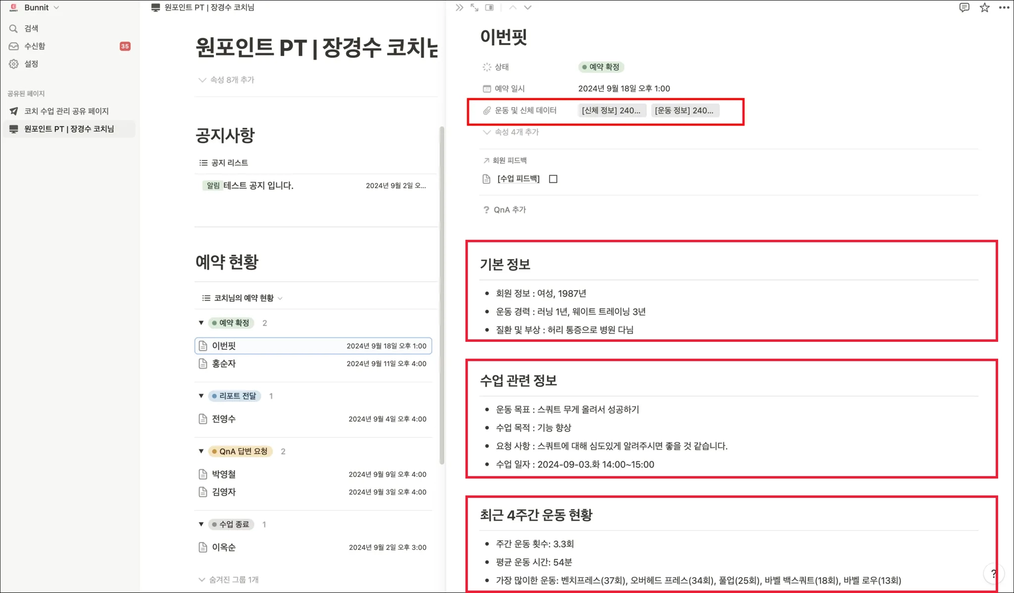 수업 예정인 회원의 이름을 누르면 ‘운동 및 신체 데이터’, ‘기본 정보’, ‘수업 관련 정보’, ‘최근 4주간 운동 현황’을 확인할 수 있습니다.