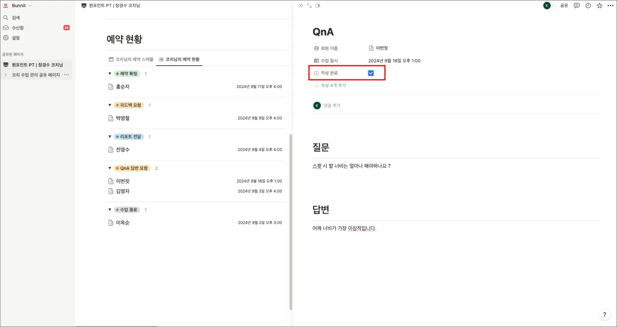 추가로 회원이 수업 관련된 질의가 요청 시 코치님께 답변을 요청 드립니다. 상태값이 ‘QnA 답변 요청’인 회원을 선택합니다.