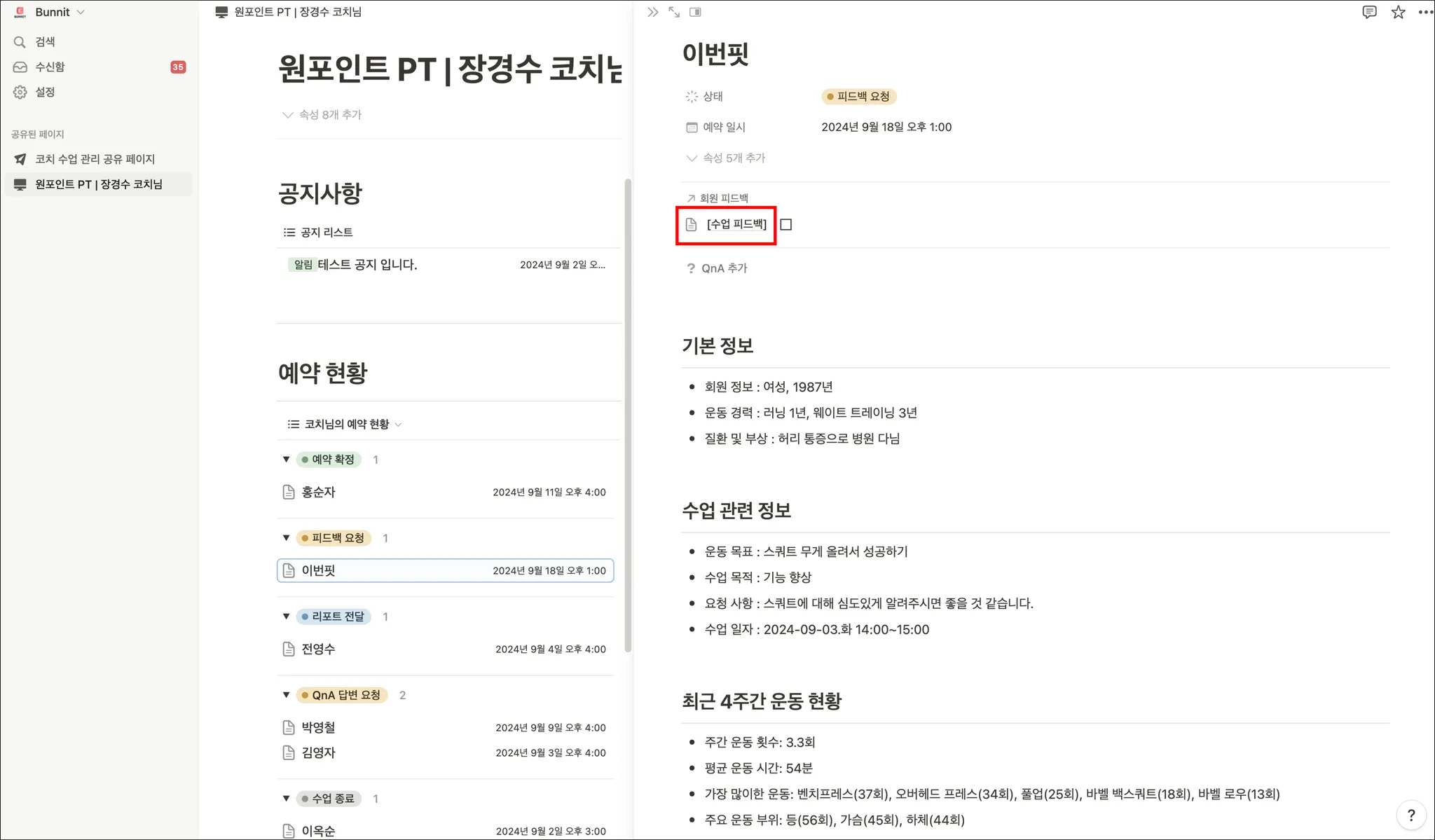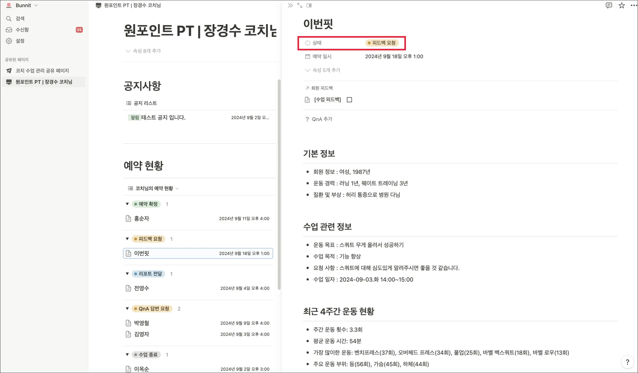 왼쪽 메뉴 탭을 보면 ‘원포인트 PT | 000 코치님’ 항목을 선택하면 아래 이미지와 같은 화면이 표시됩니다.