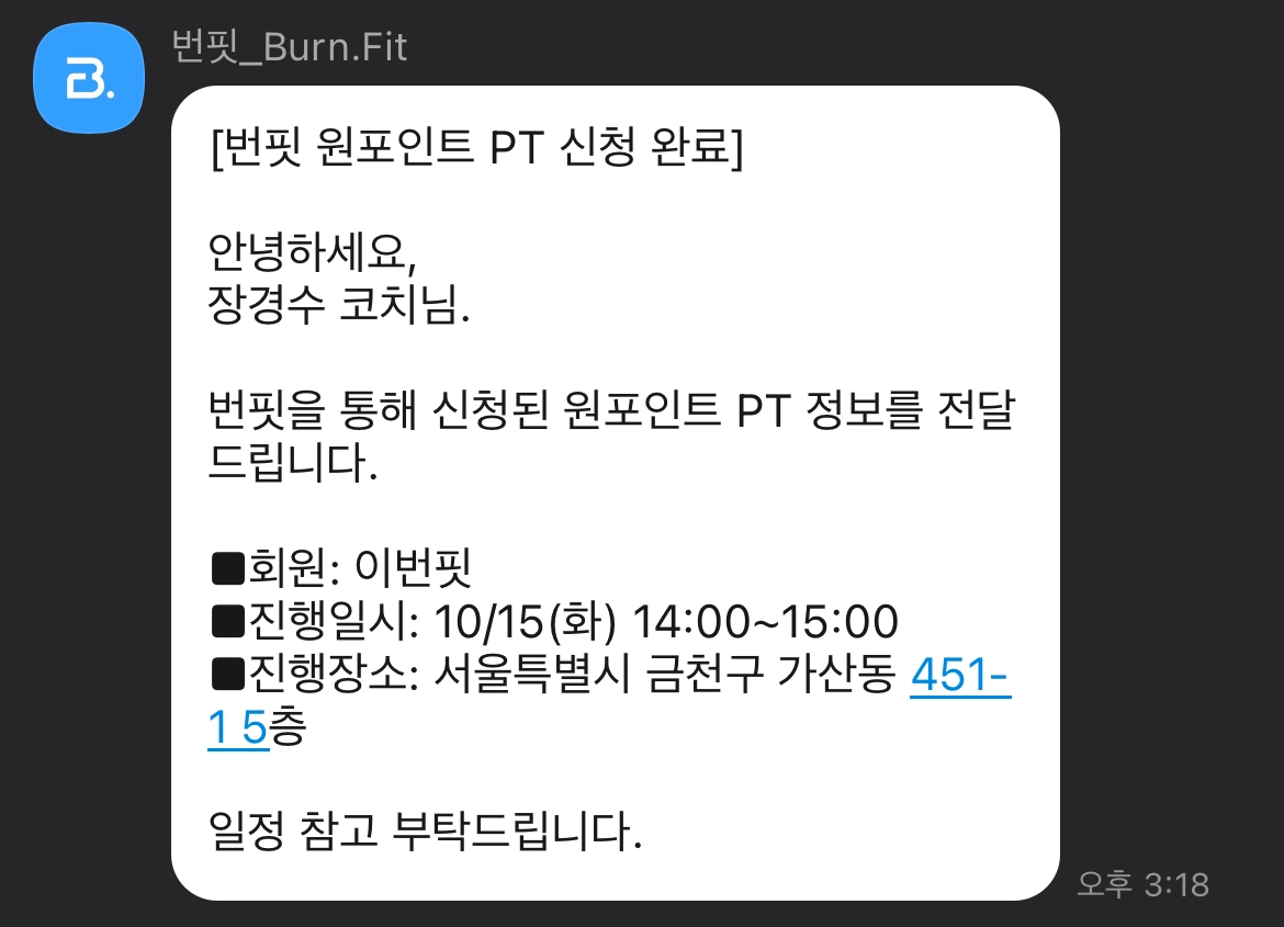 번핏 앱 내에서 예약 및 결제 즉시 카카오톡으로 안내 메시지를 발송해 드립니다.