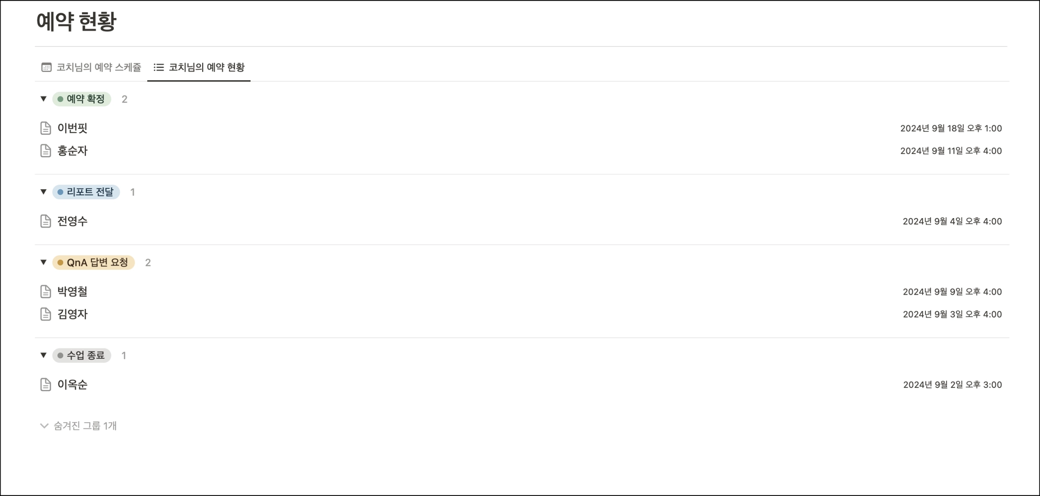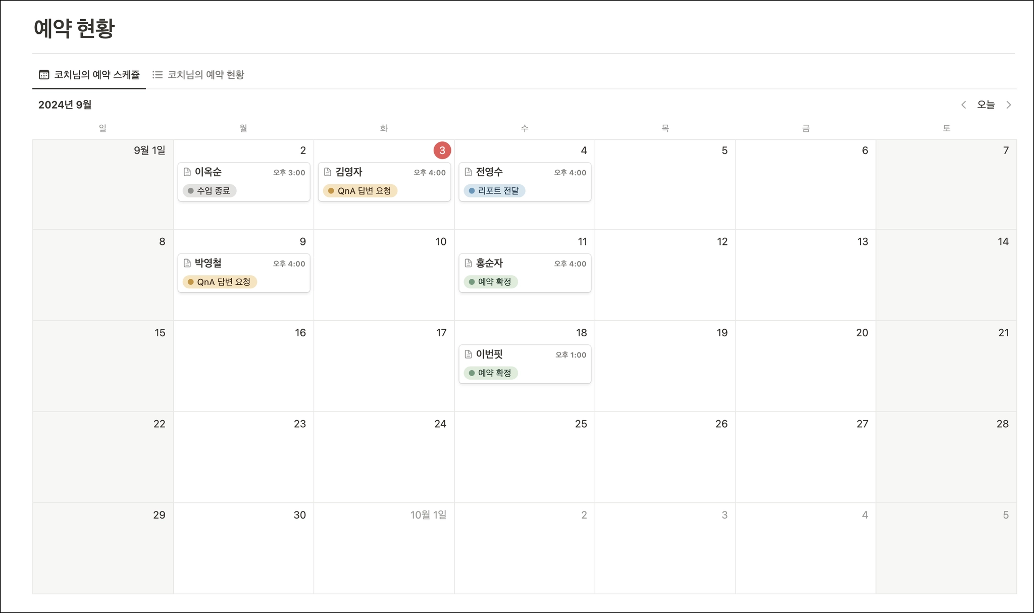 ‘코치님의 예약 현황’을 누르면 예약 상태별로도 확인할 수 있습니다.