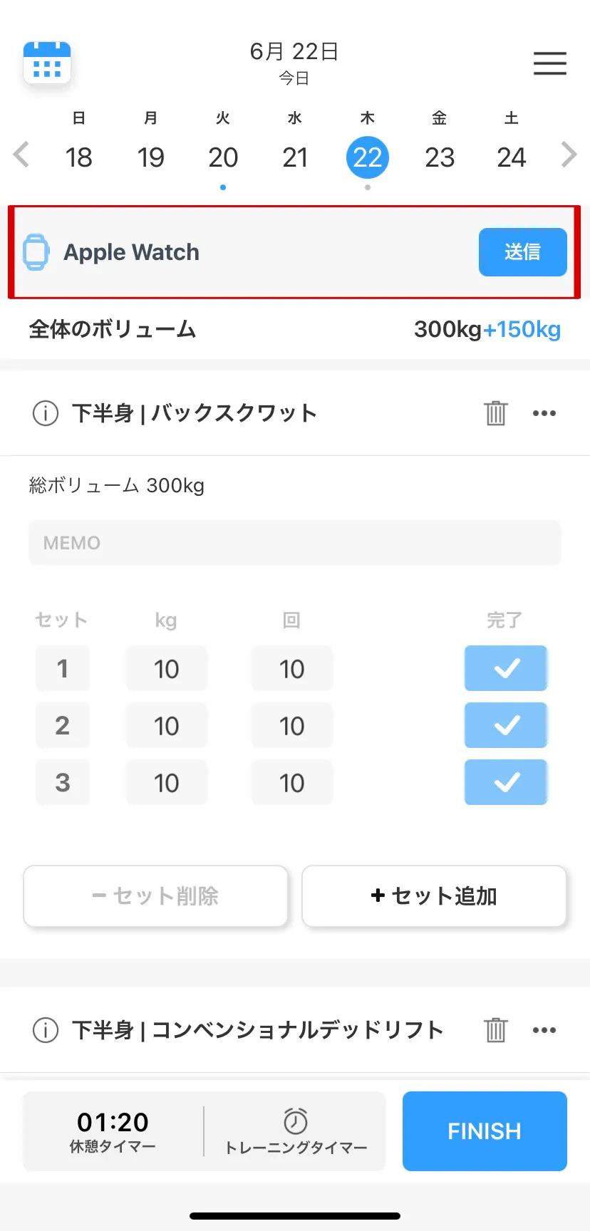 トレーニング計画を入力する画面の上段にある‘Apple Watch 送信’ を通じてデータを送信