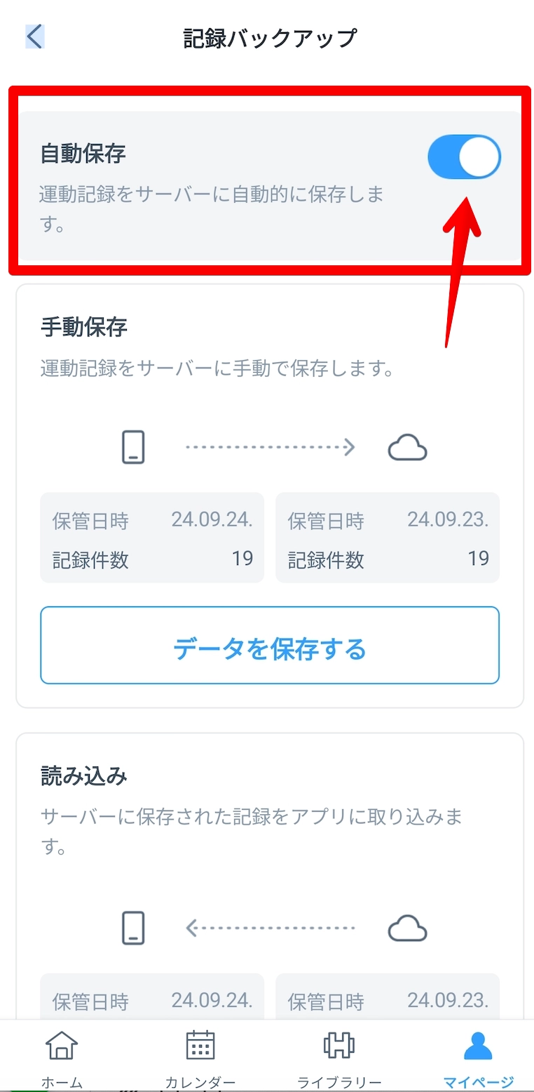 機種変更前の端末で、データが残っていることを確認し、アプリ内にある「マイページ」から「記録バックアップ」を押し、「データを保存する」を押す