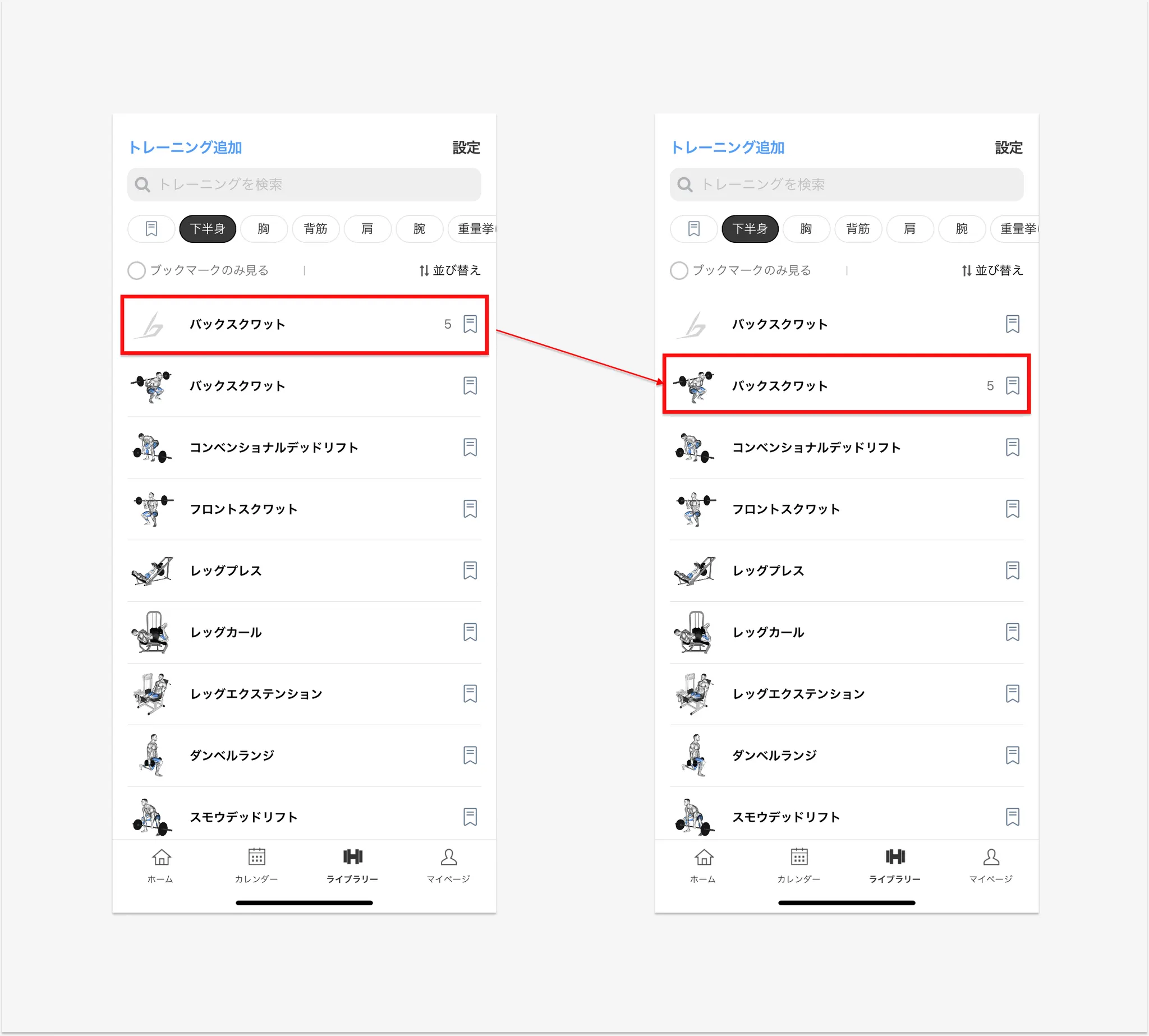 例)ユーザーが直接作った「バックスクワット」のデータを新しく追加された「バックスクワット」に移行する場合
