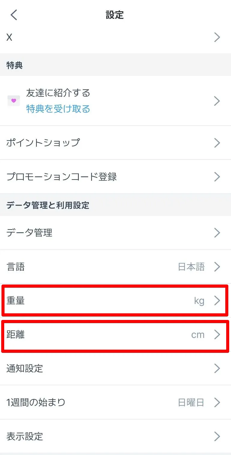 ユーザー設定>「重量」または「距離」をタップし、単位を選択