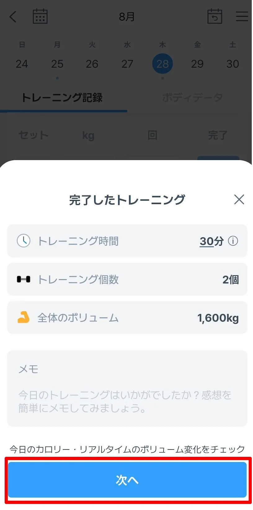 計画したトレーニングが全て終了したら右下の「トレーニング完了」ボタンをタップ