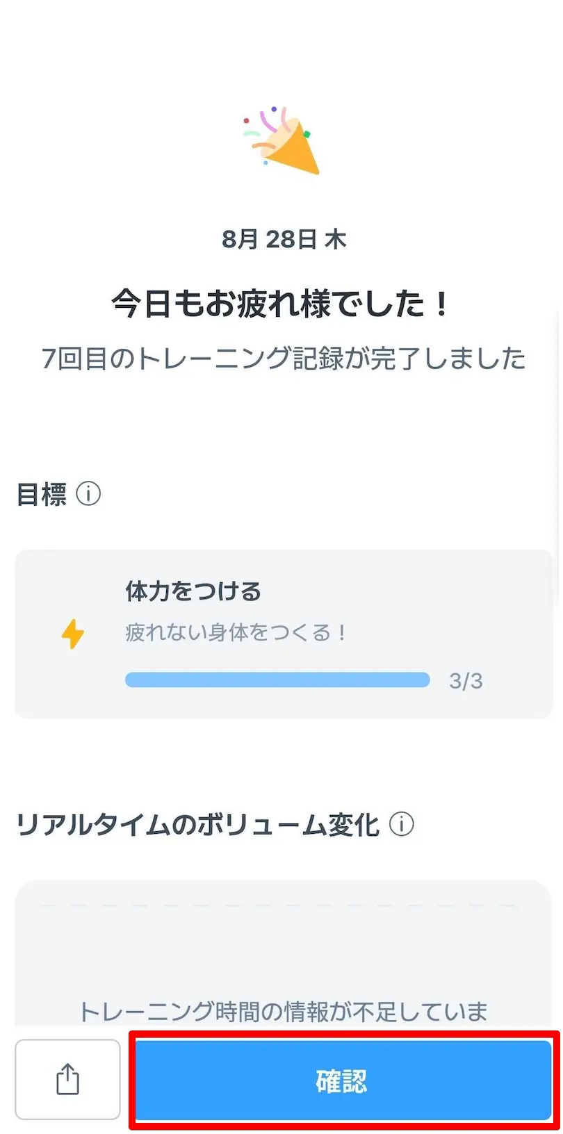 「トレーニング記録完了」画面が表示されるので、内容を確認し、「確認」ボタンをタップする