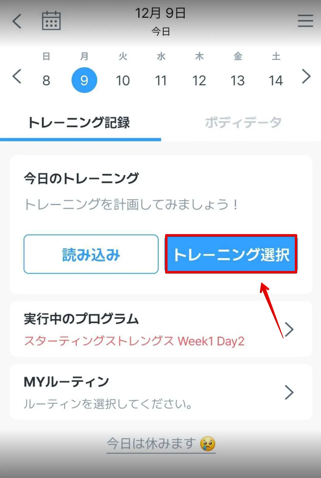 ホーム>トレーニングを始める、または、カレンダー>今日のトレーニングプランを立てるをタップ