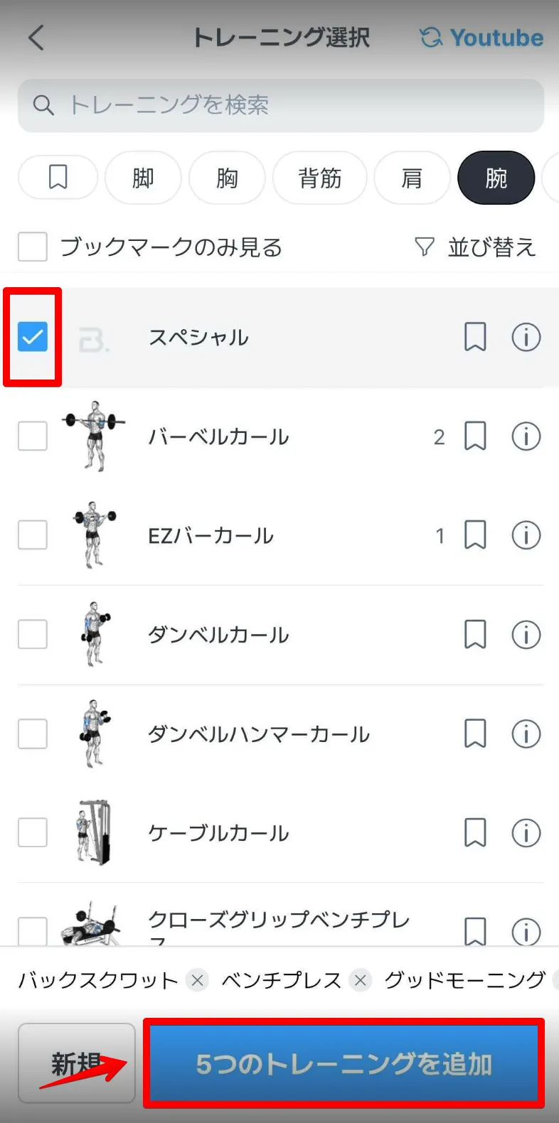 トレーニング選択画面で行いたいトレーニング種目を選択>