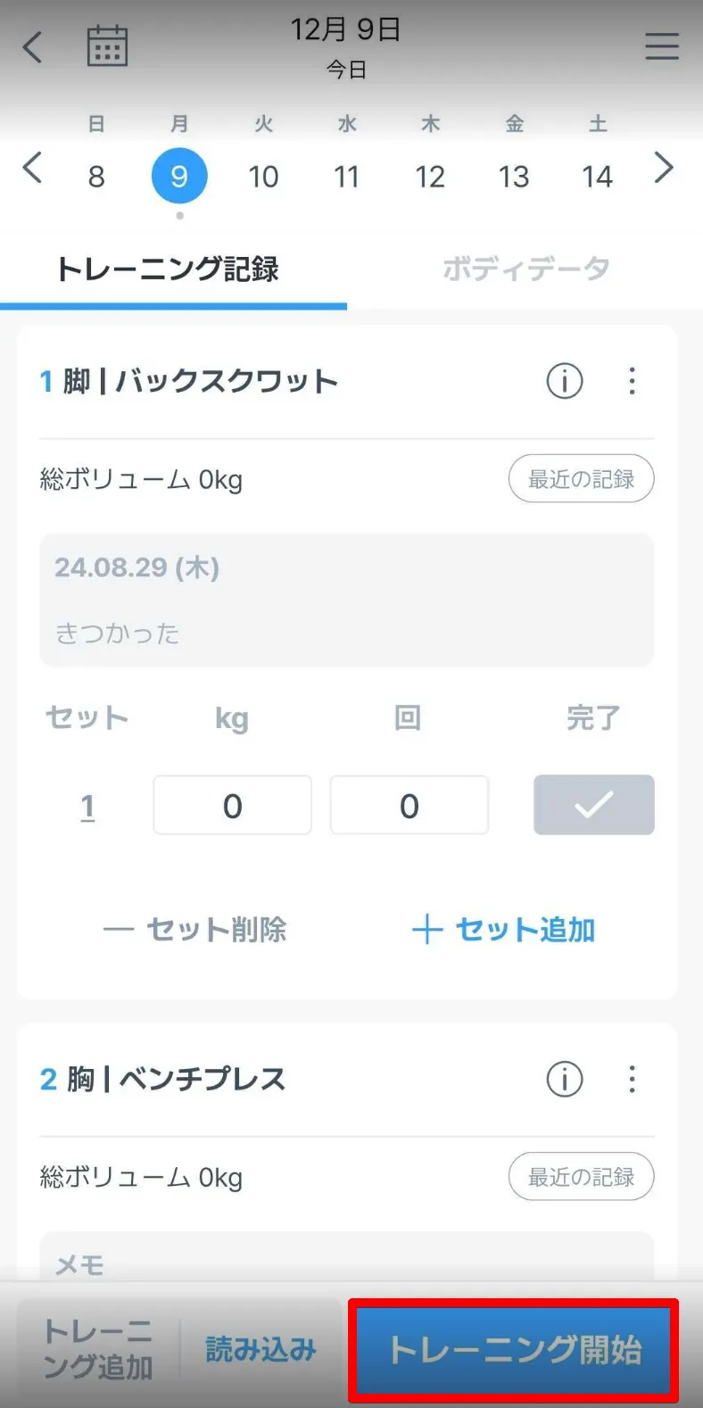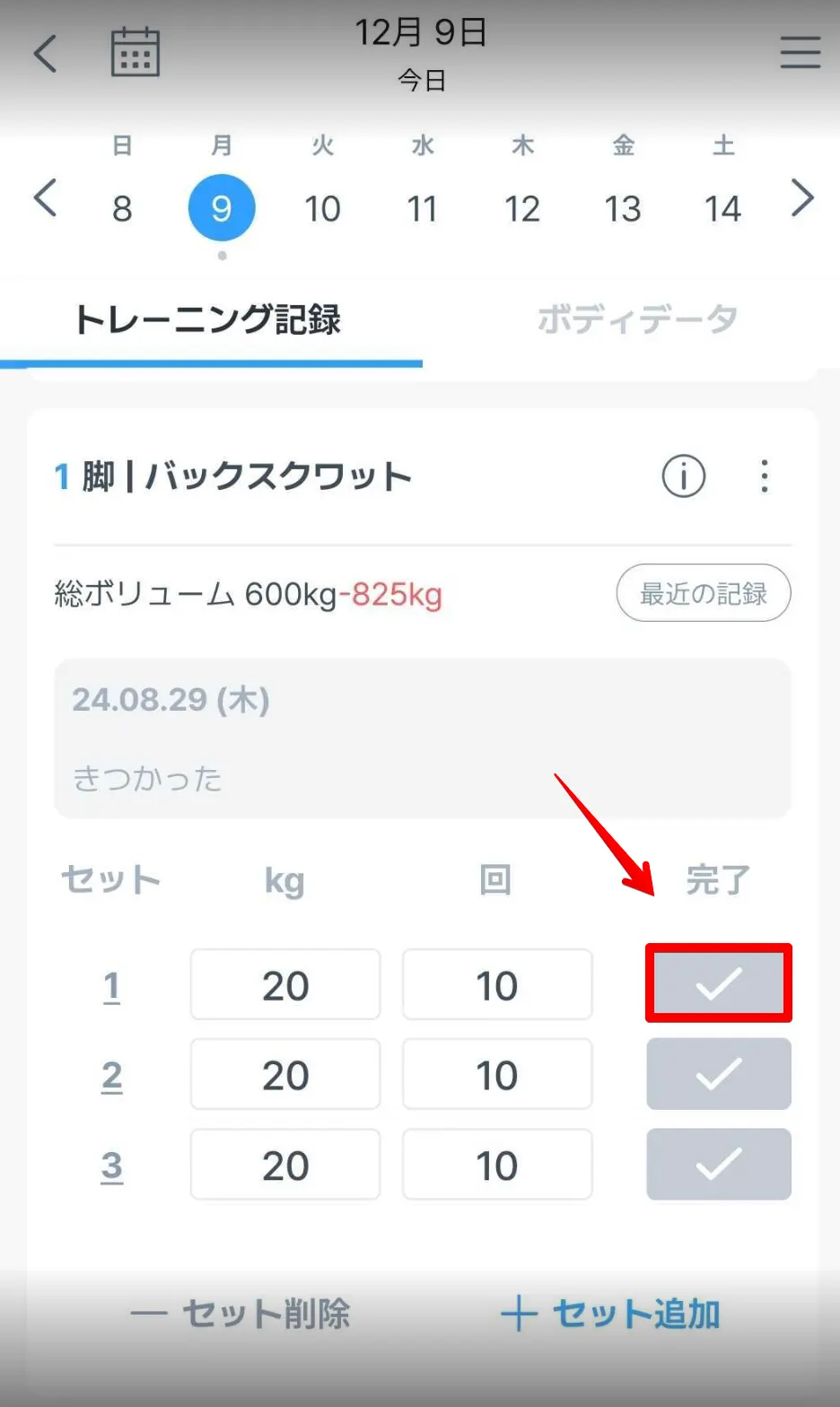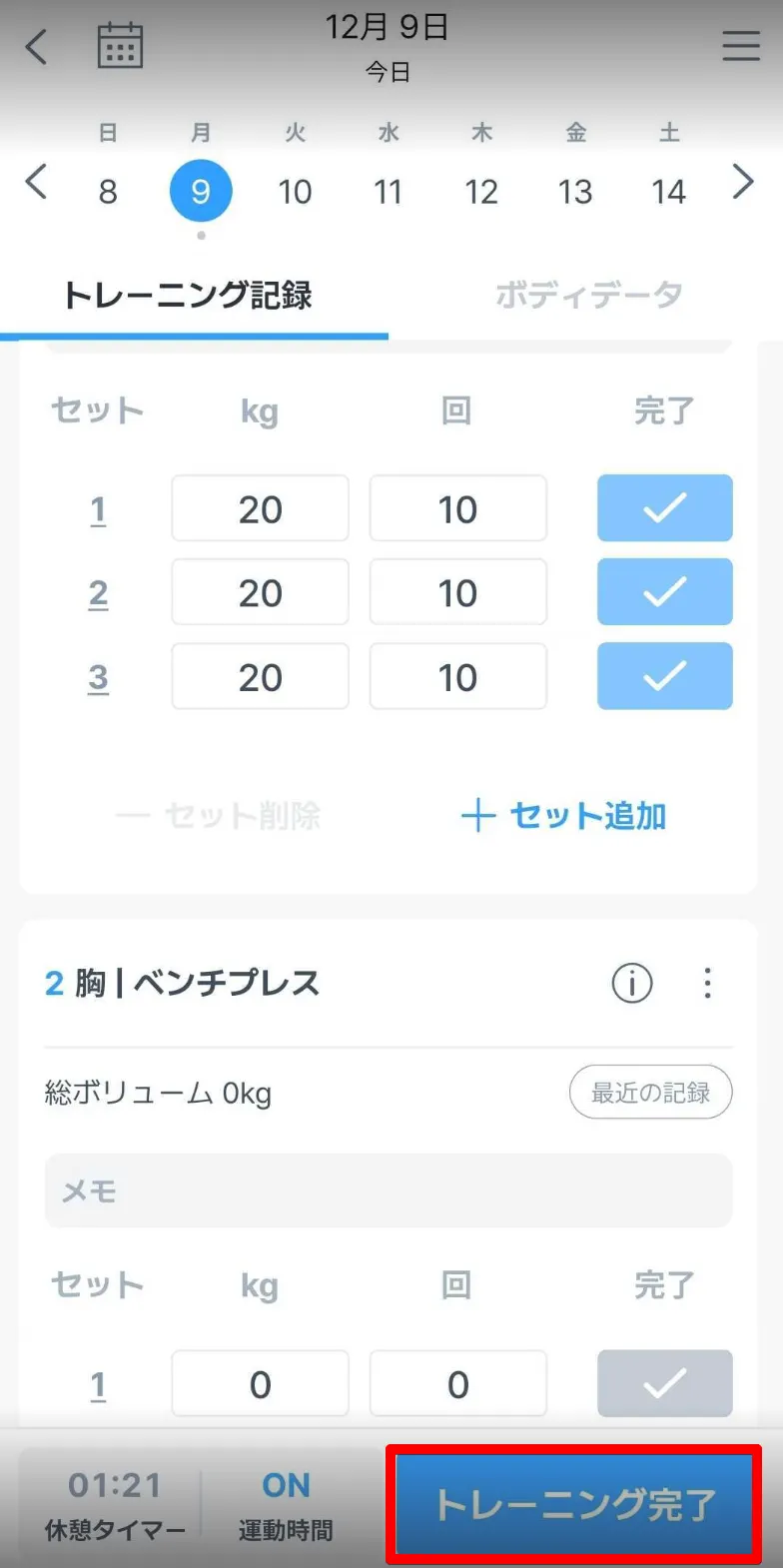 各種目ごとにkg・回数等を入力し、各セットが終了したら右側の「完了