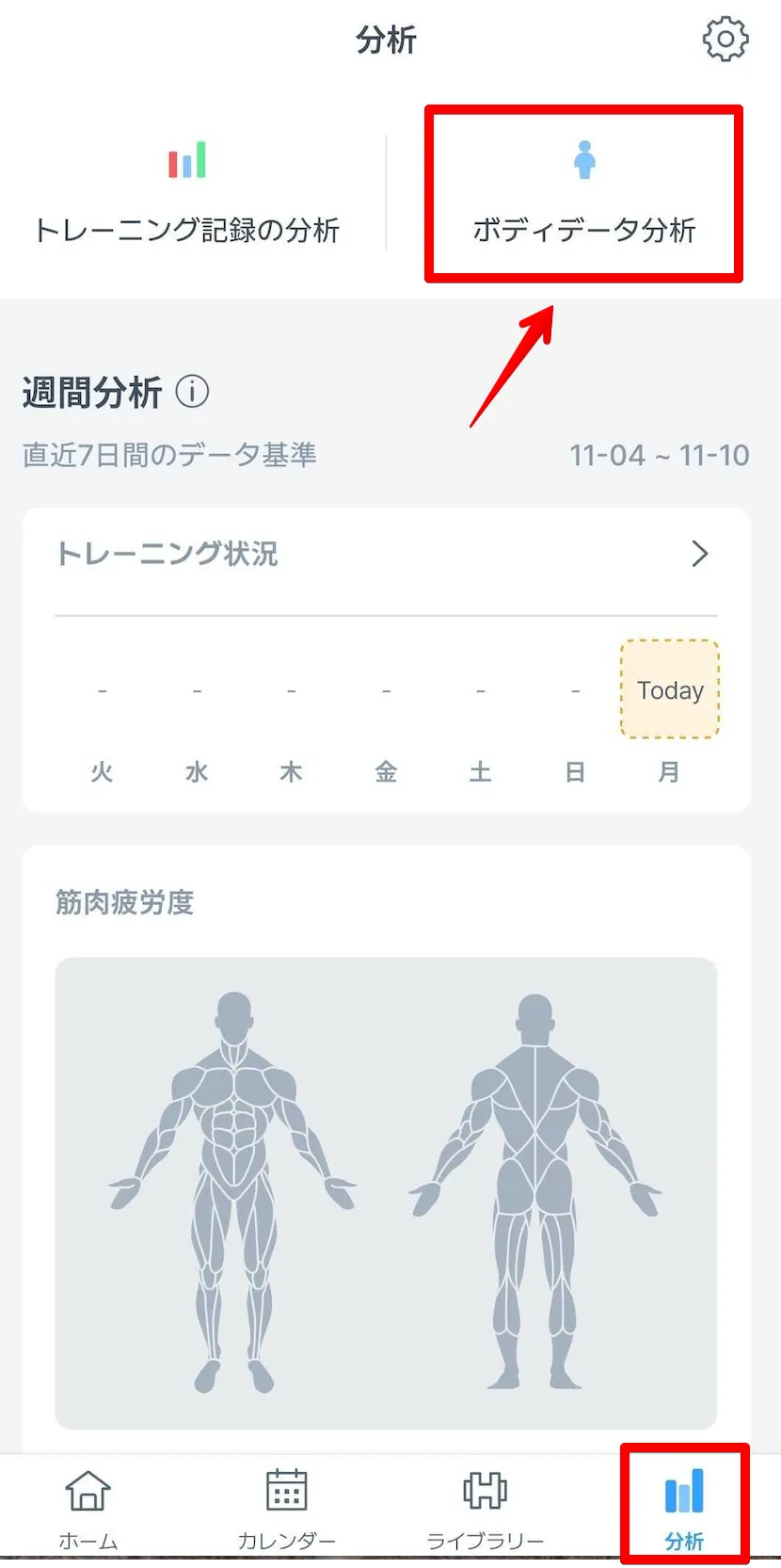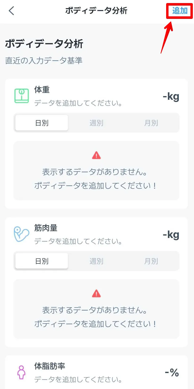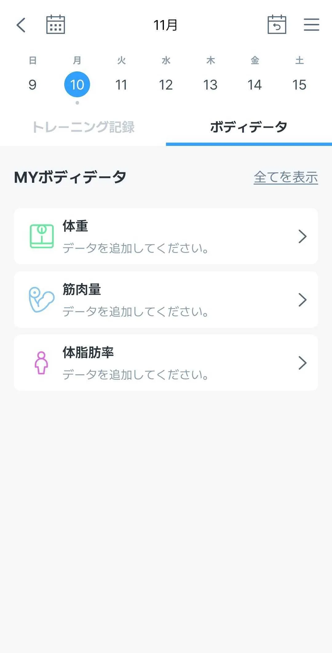 「トレーニング記録」画面で「ボディデータ」をタップし、入力