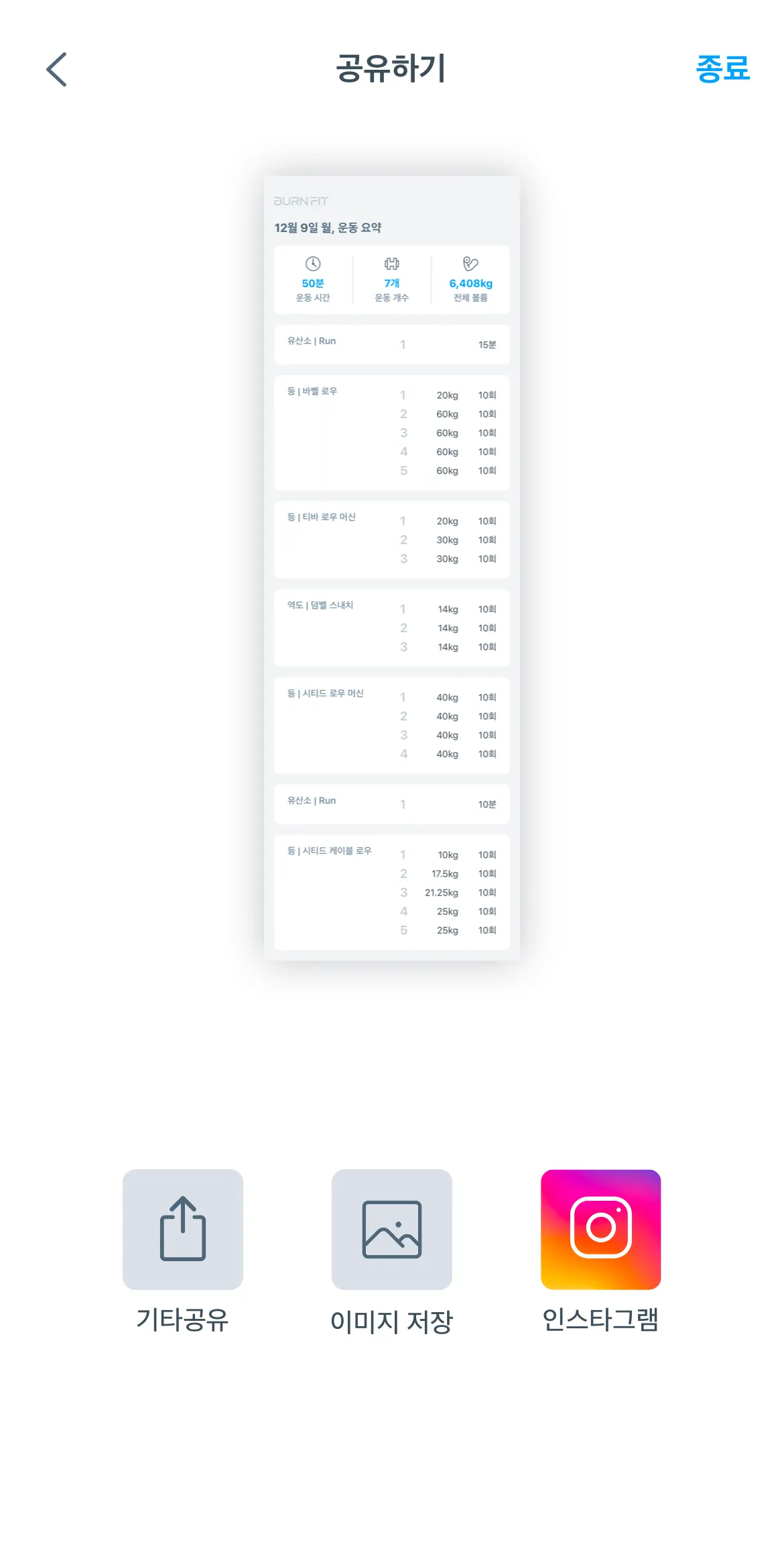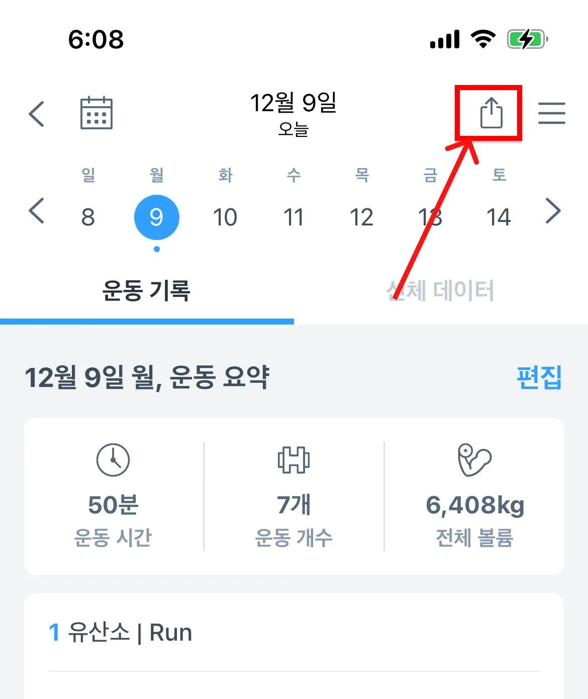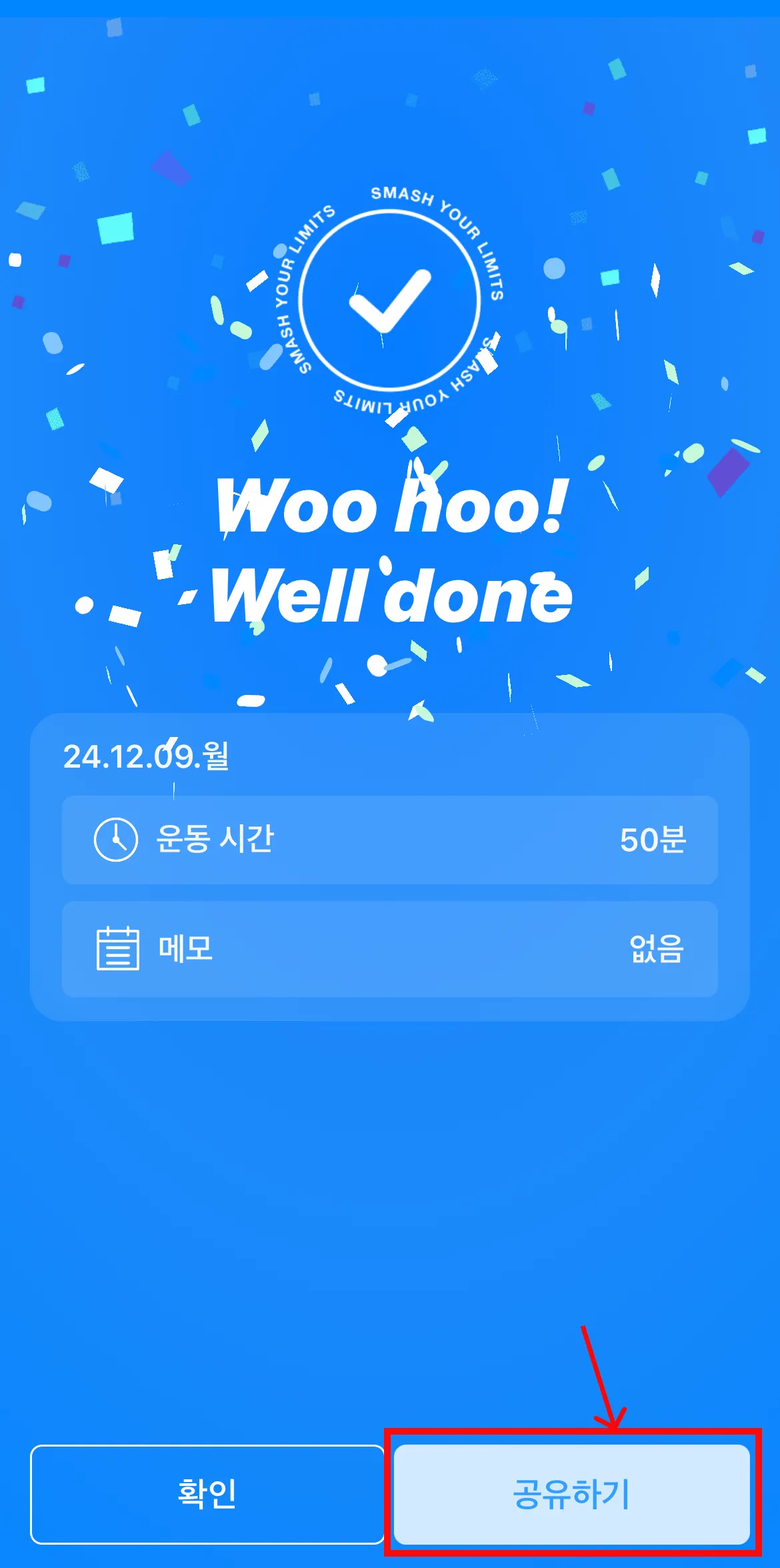 운동 완료 화면에서 오른쪽 하단의 「공유」 버튼 클릭
