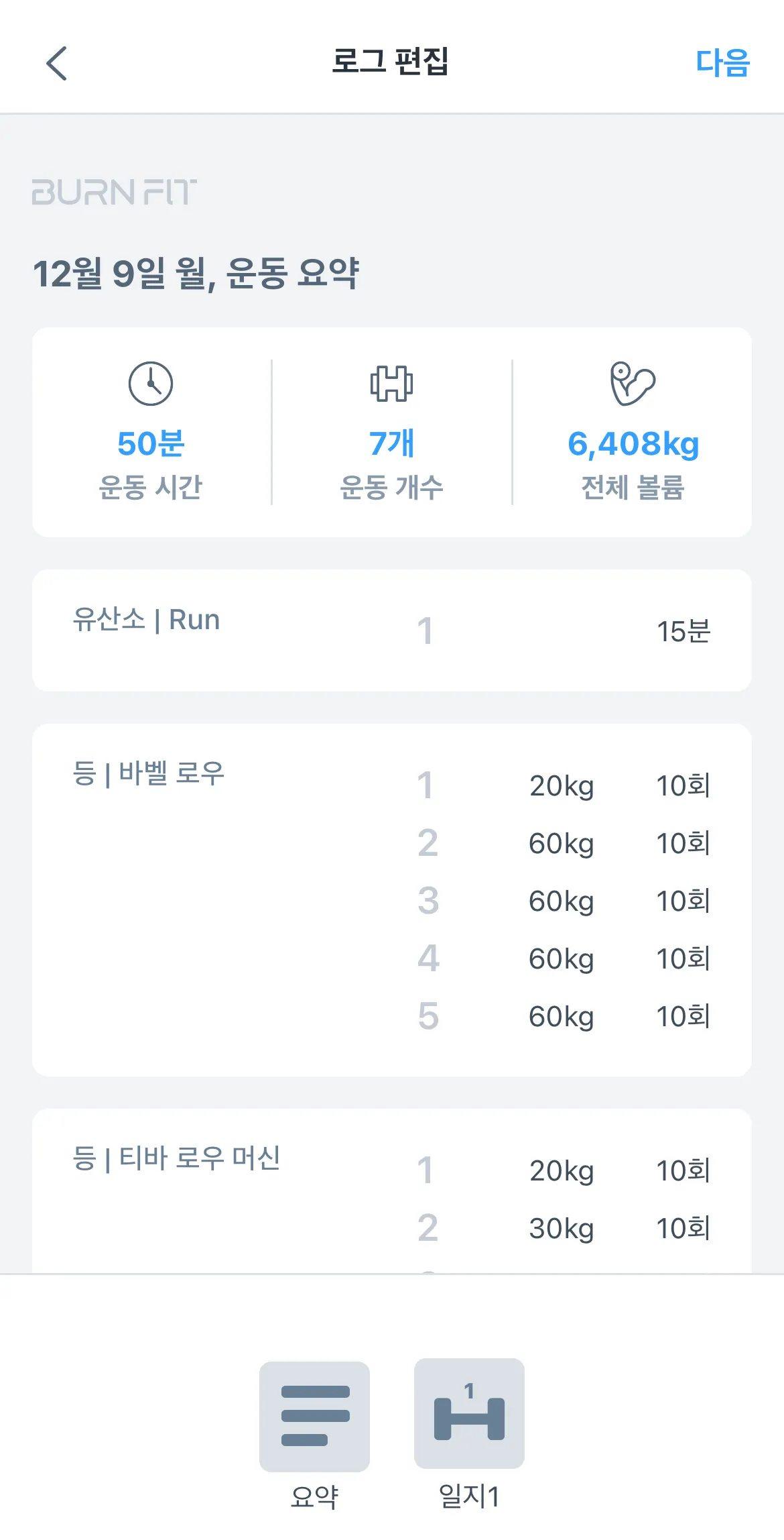 ① 번핏 로그 기록: 하루 트레이닝 기록을 확인할 수 있는 이미지