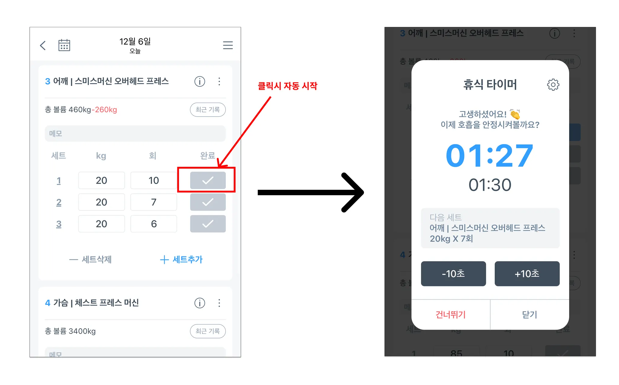 기본적으로 운동 세트를 완료하면 자동으로 휴식 타이머가 실행됩니다.