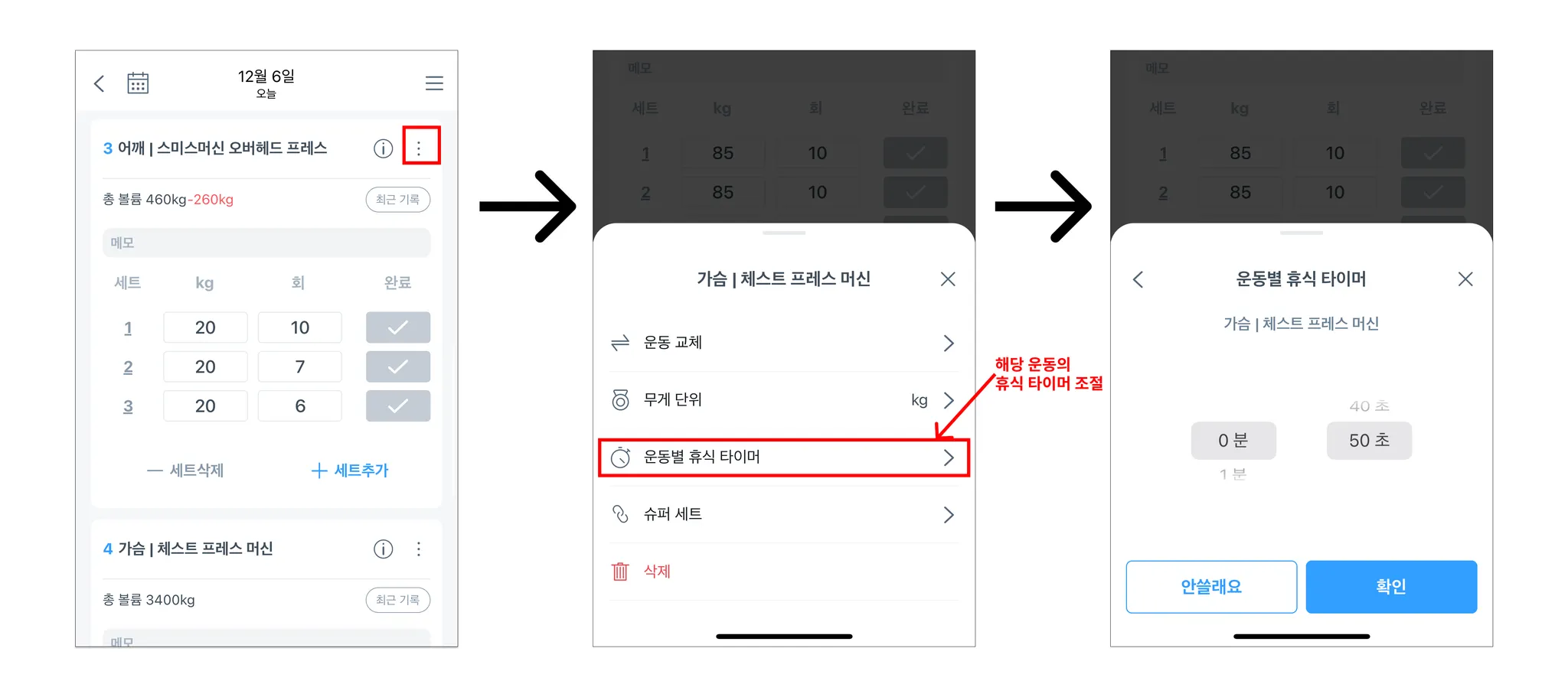 휴식 타이머는 각 운동별로 따로 설정할 수 있습니다.