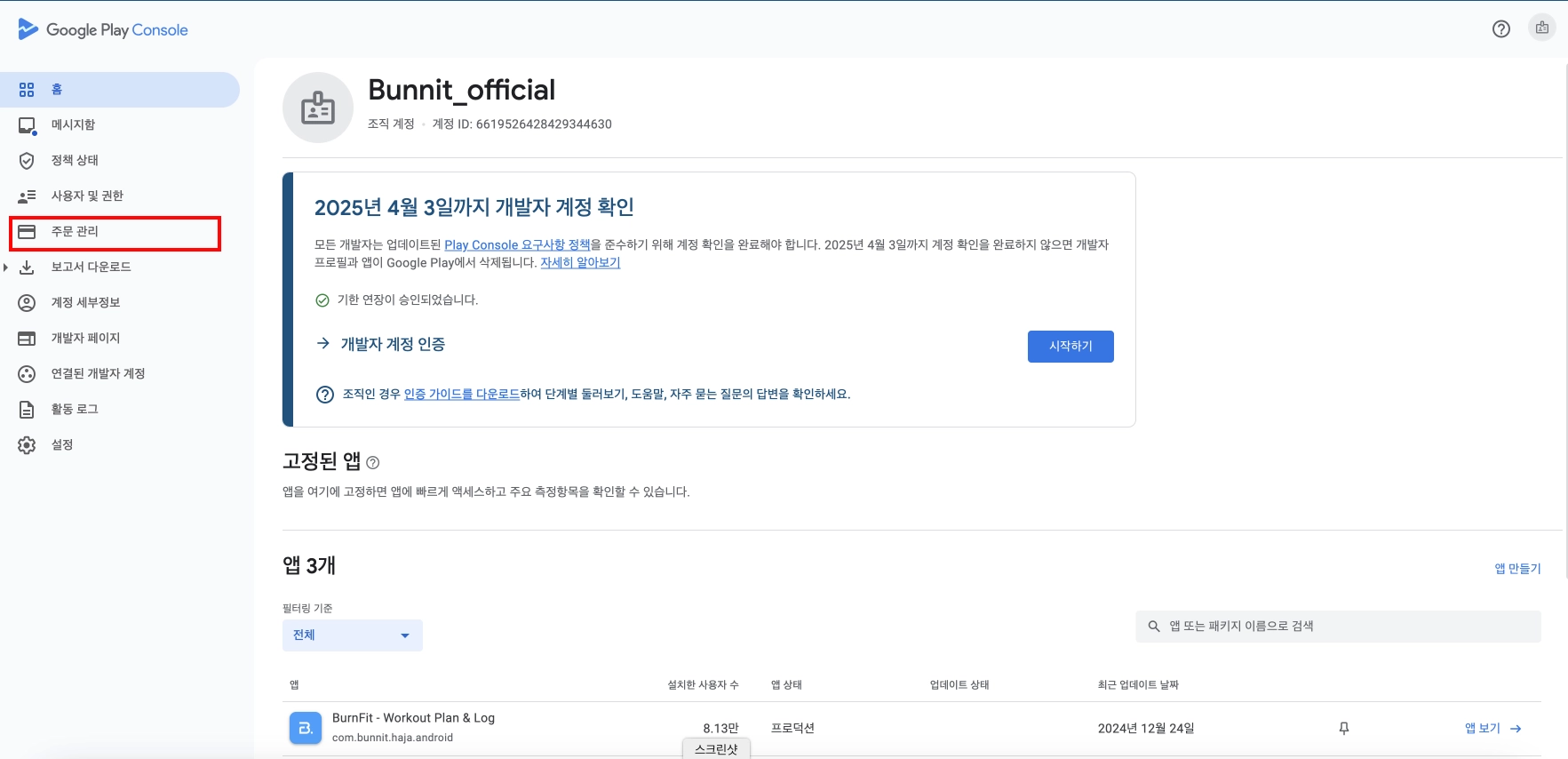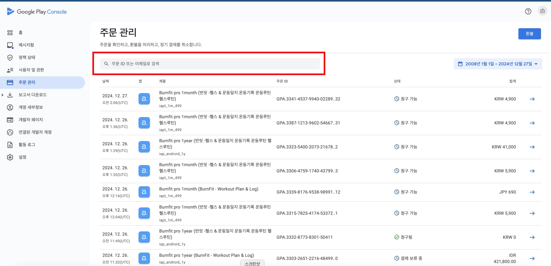 Google PlayStore Console 로 로그인하고 왼쪽의 “주문 관리” 클릭