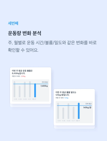 주, 월별로 운동 시간/볼륨/밀도와 같은 변화를 바로 확인할 수 있어요.