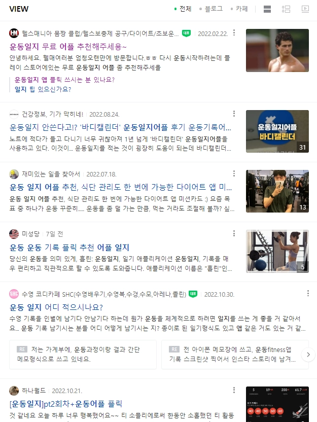 ‘운동 어플 일지’ 검색 시 상단에 후기 게시글 노출 → 유입 용이