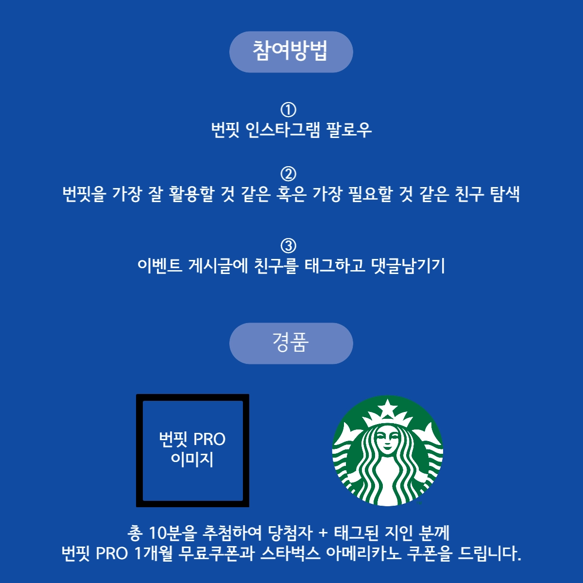 댓글을 작성하신 10분을 추첨하여 당첨자+태그된 지인분 총 20분께 번핏PRO 1개월 무료이용권 + 스타벅스 아메리카노 모바일 쿠폰
