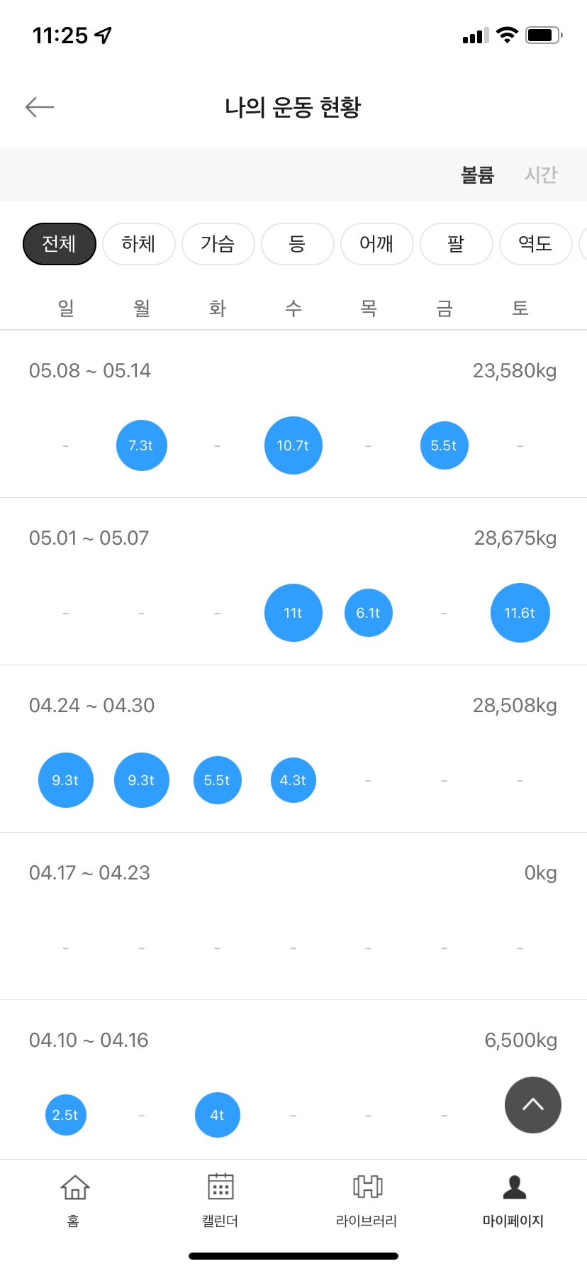 부위별로 들어올린 볼륨을 확인할 수 있습니다.