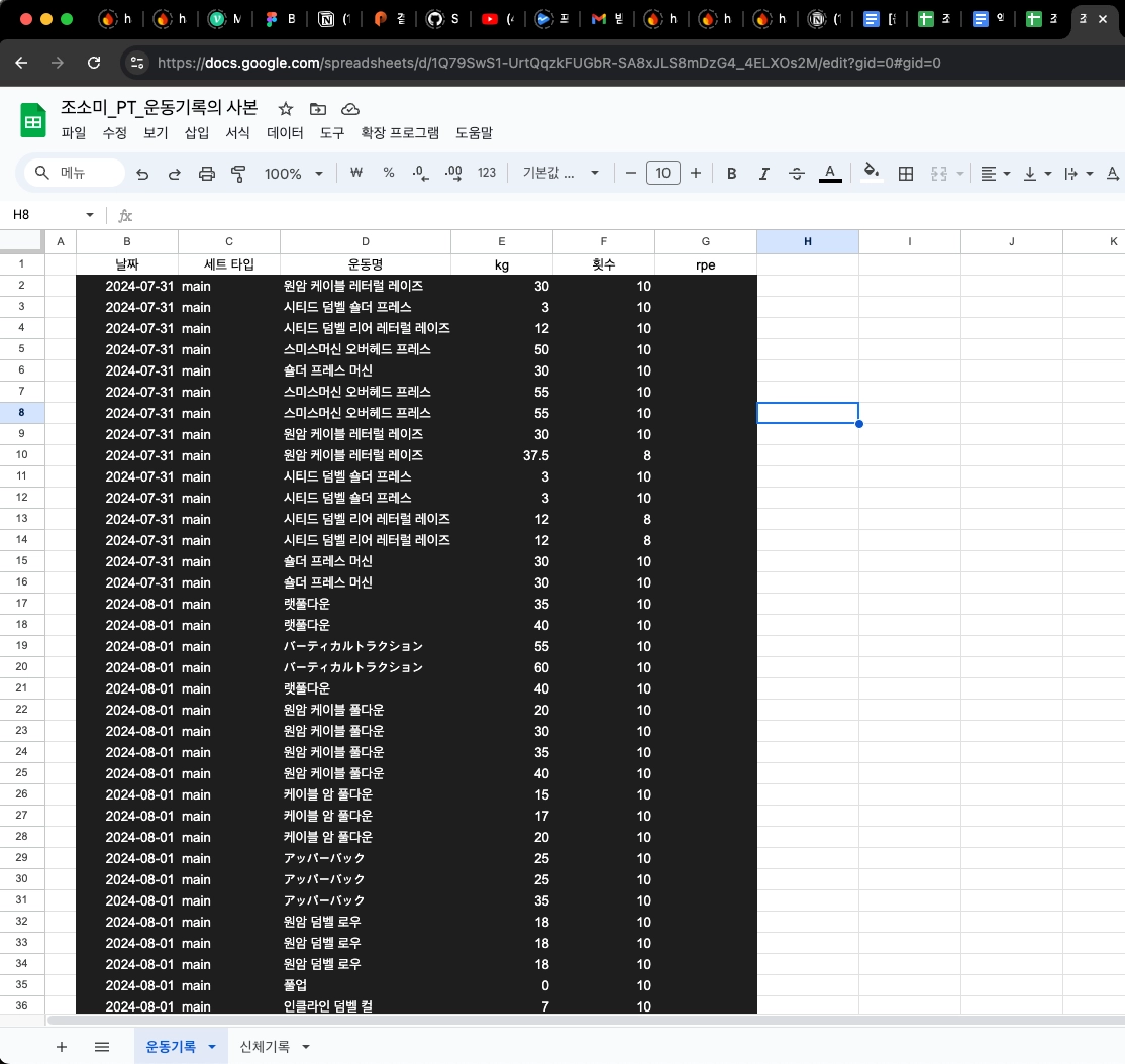 엑셀 템플릿에 복사 - 운동 기록