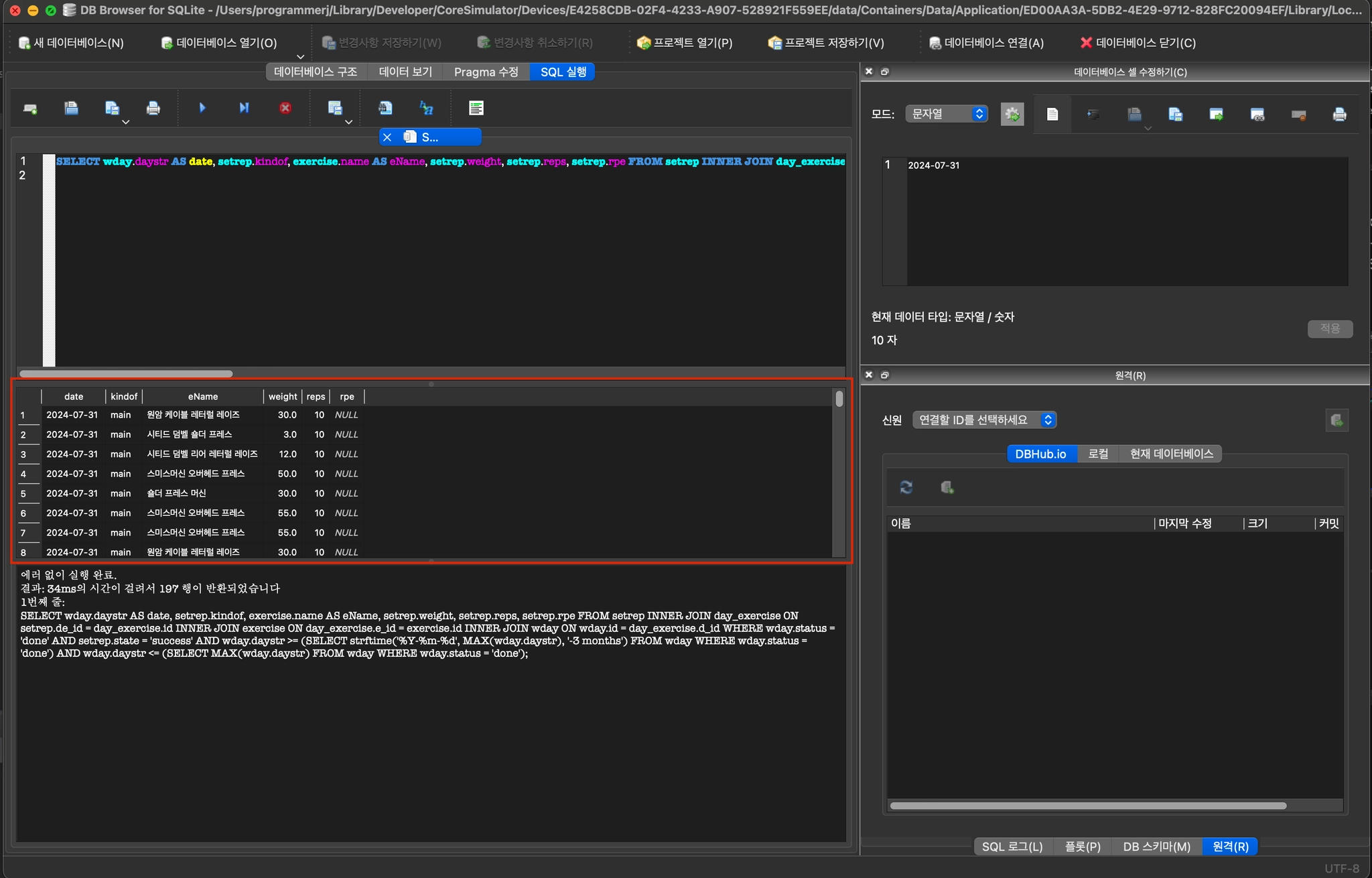 운동 기록 쿼리 실행