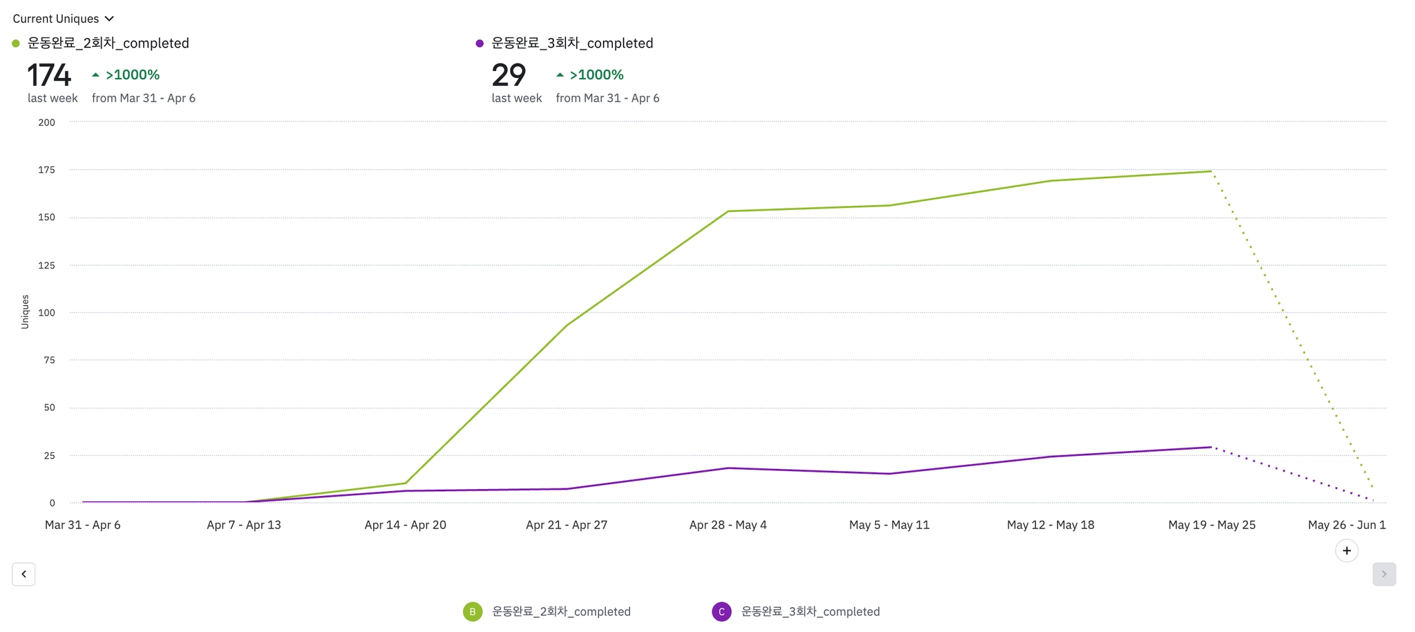 운동 완료 후에 이탈 전 웰컴메시지까지 바로 진입한 유저는 8%이고, 온보딩까지 완료한 유저는 6%이다.
