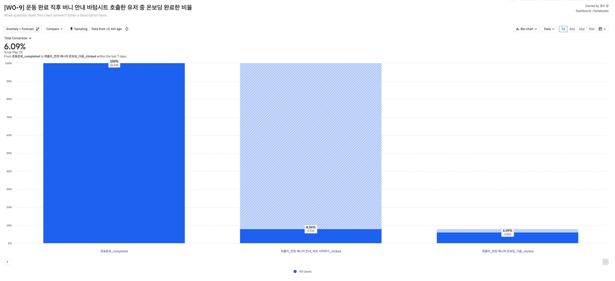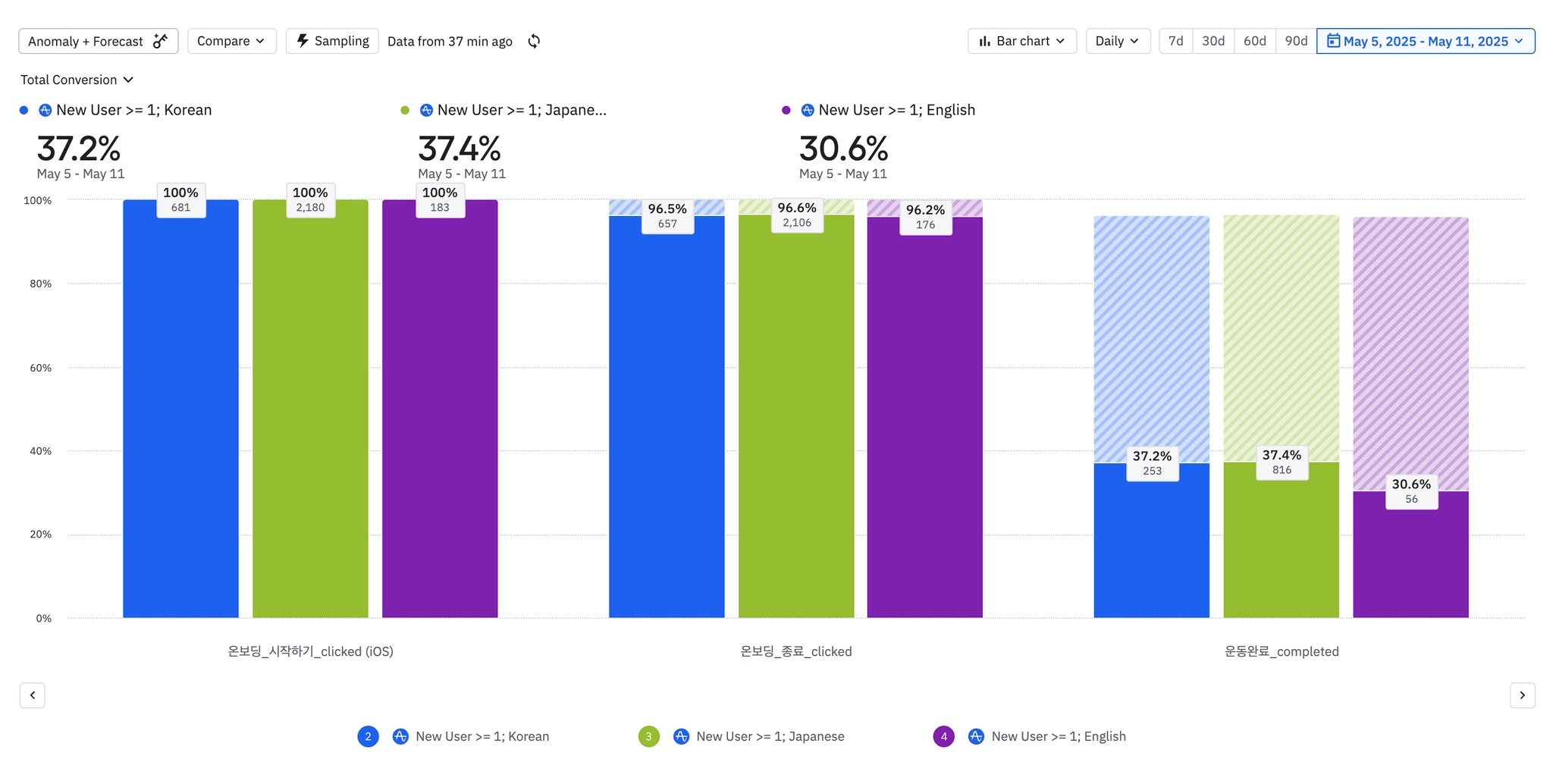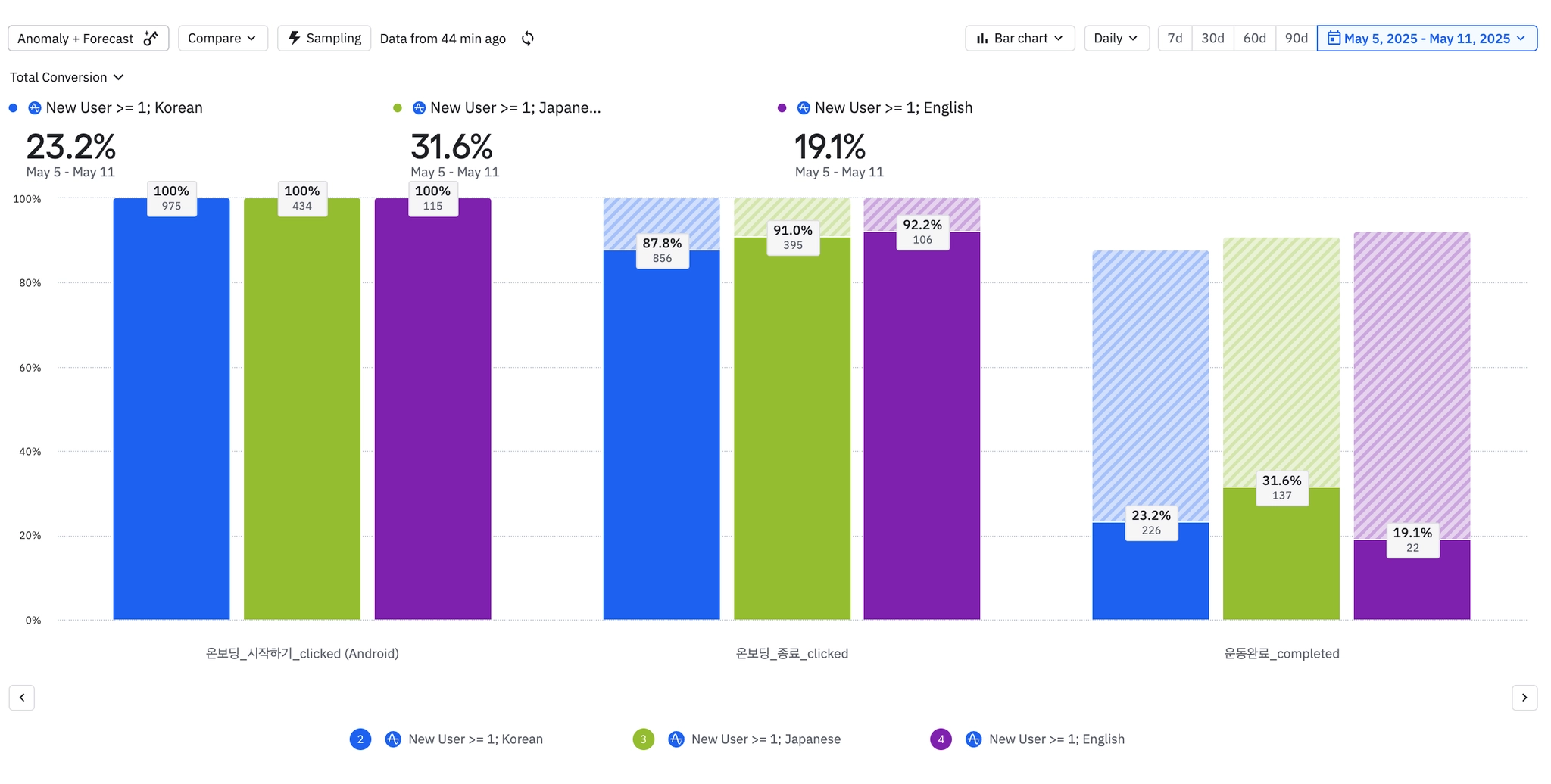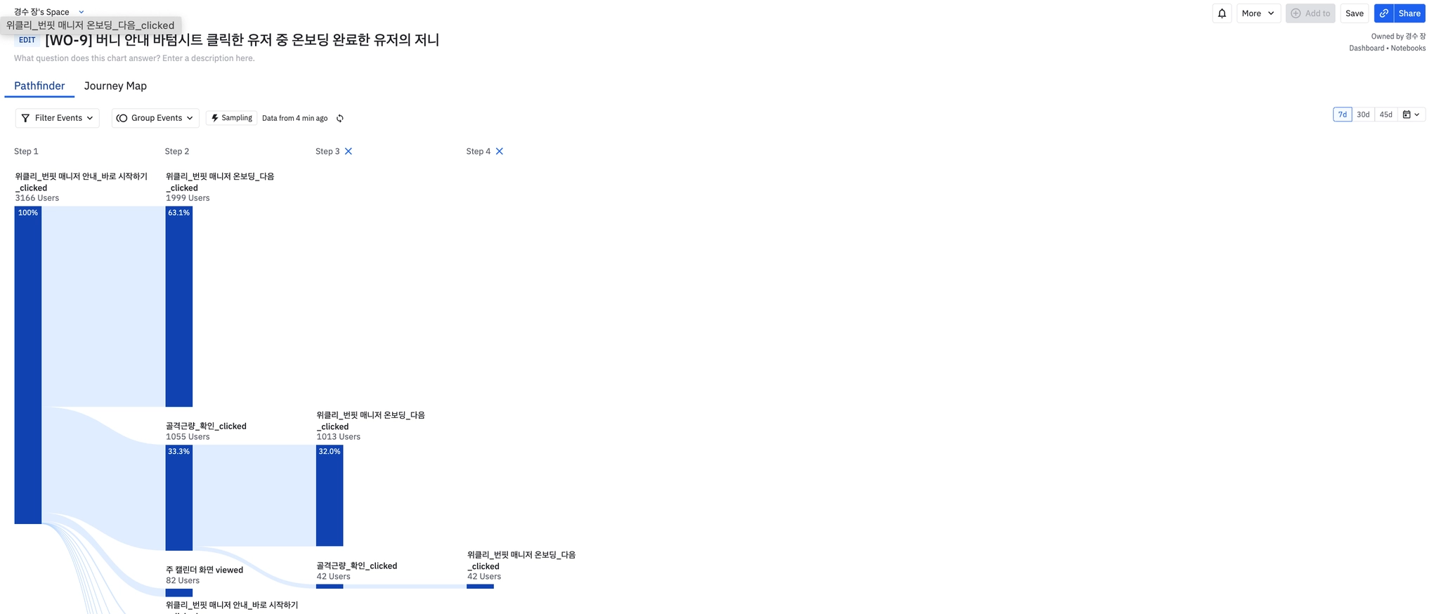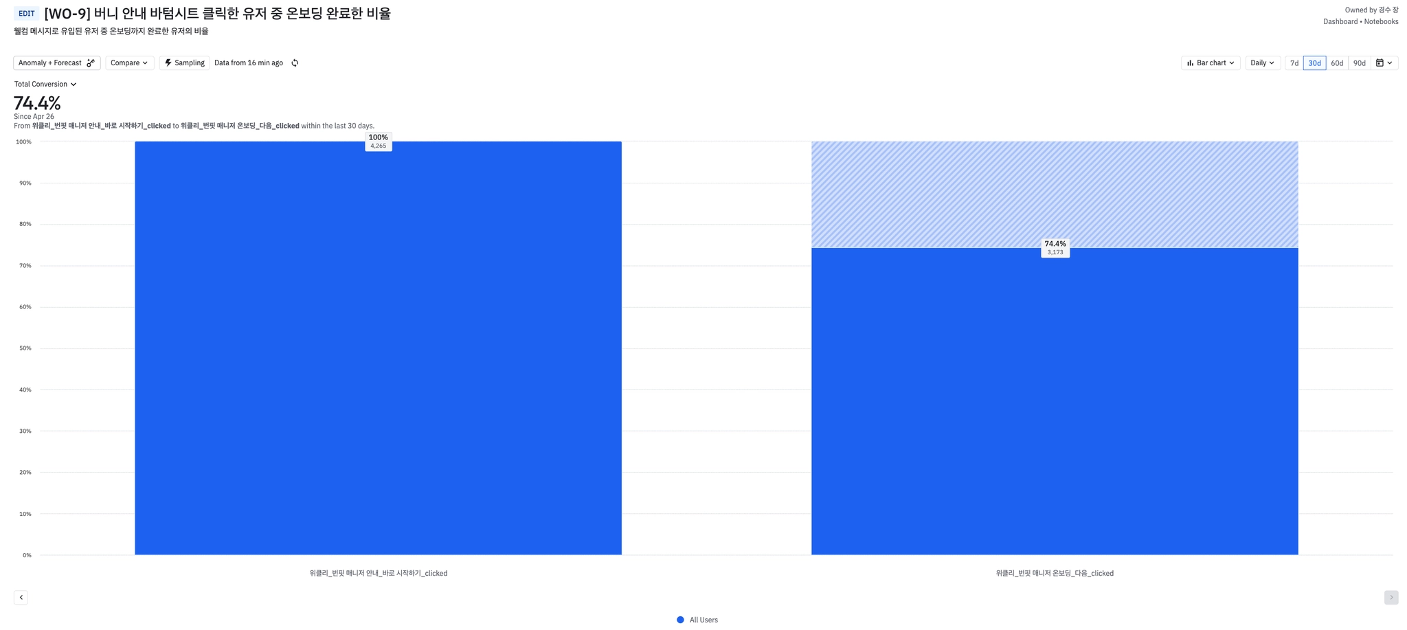 웰컴메시지를 눌러본 유저 중 74%가 온보딩까지 완료했다.