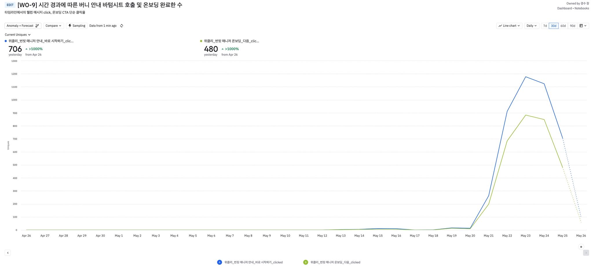 5월 23일 금요일 하루 최고 1,178명의 유저가 웰컴 메시지를 눌러 보았다.
