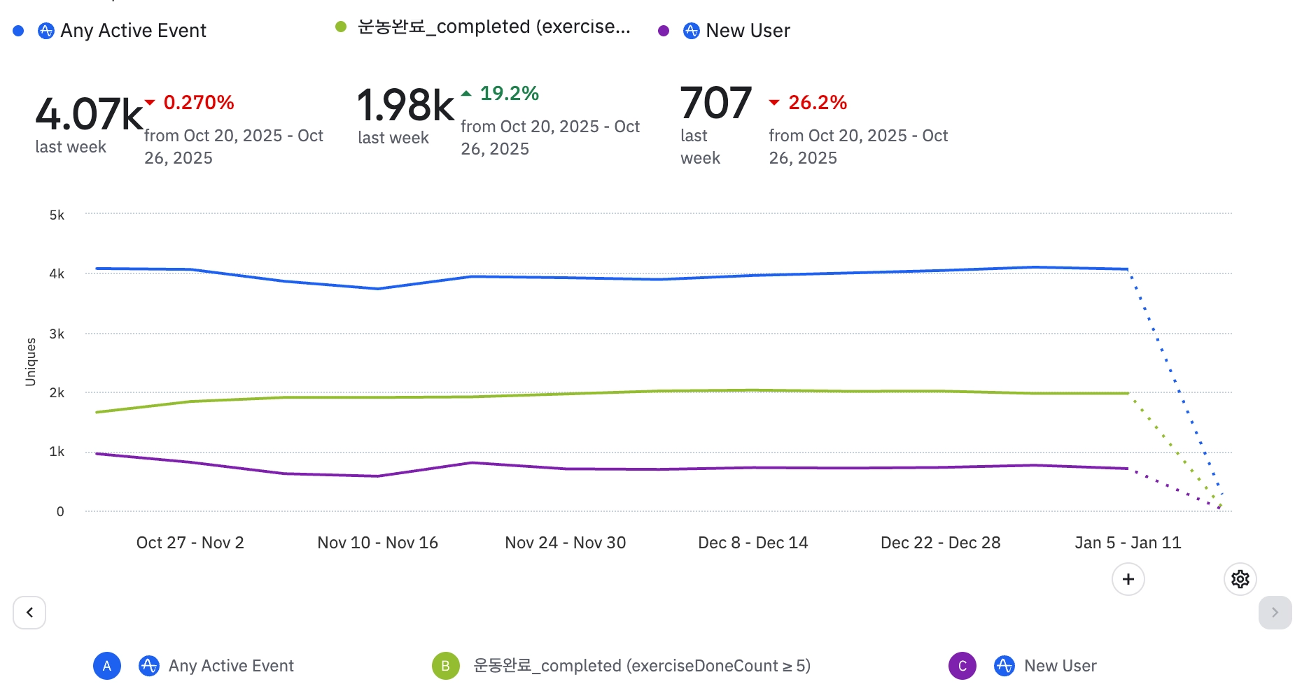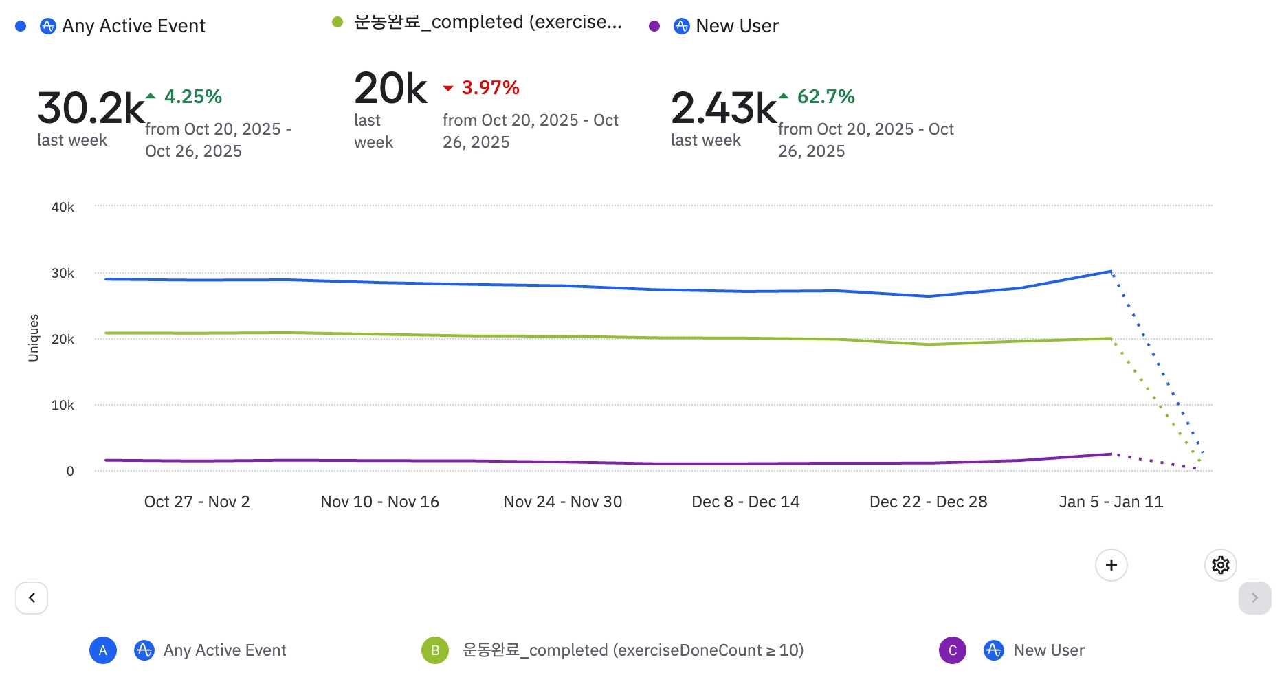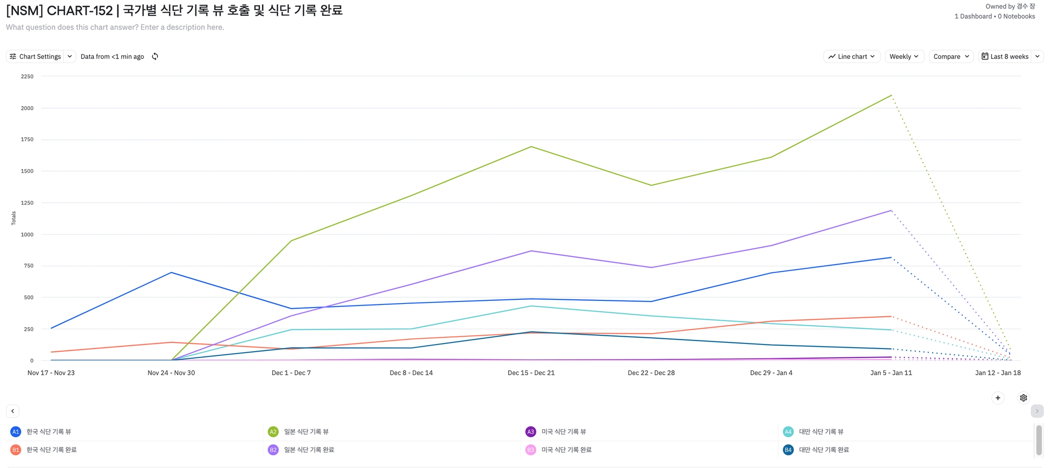 전반적으로 식단 기록 뷰 및 완료 이벤트 수가 증가하고 있는 추세이다.