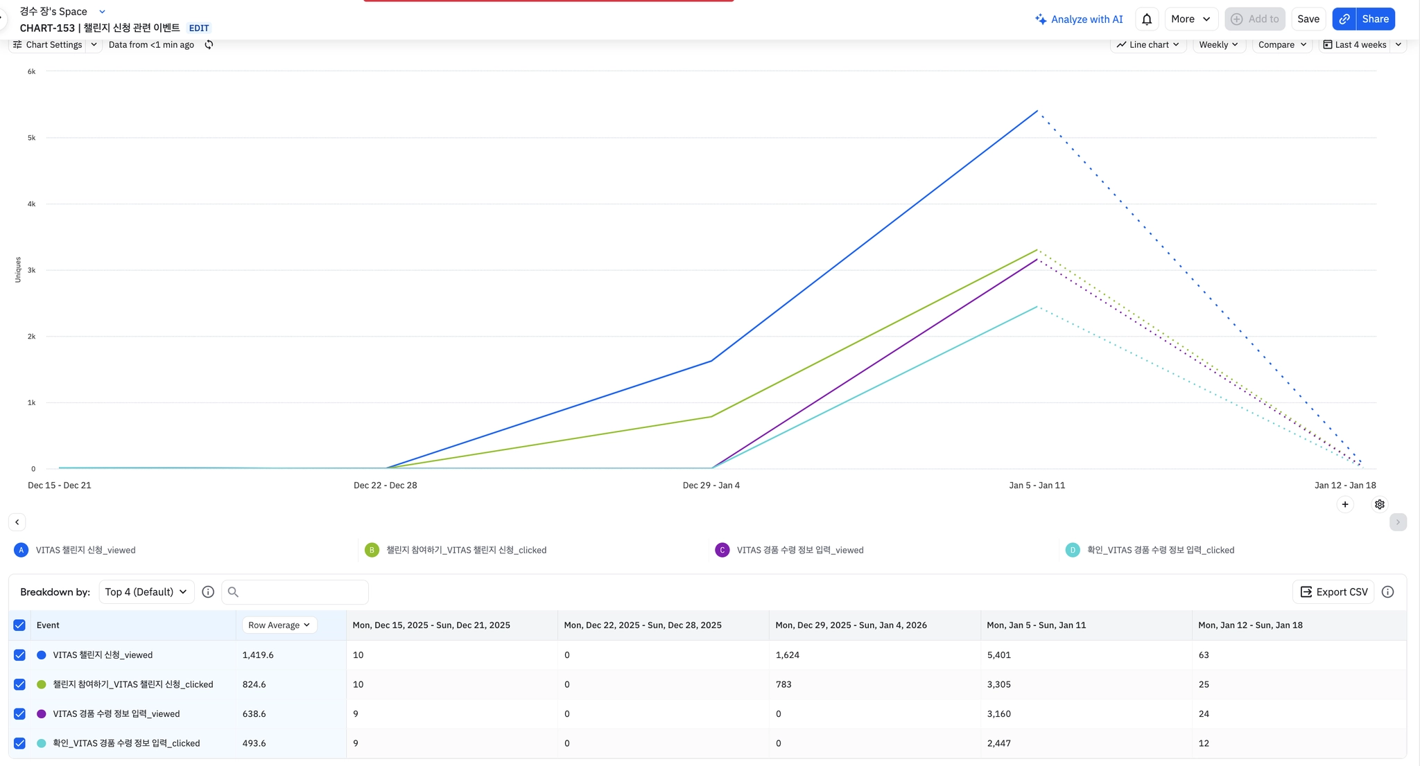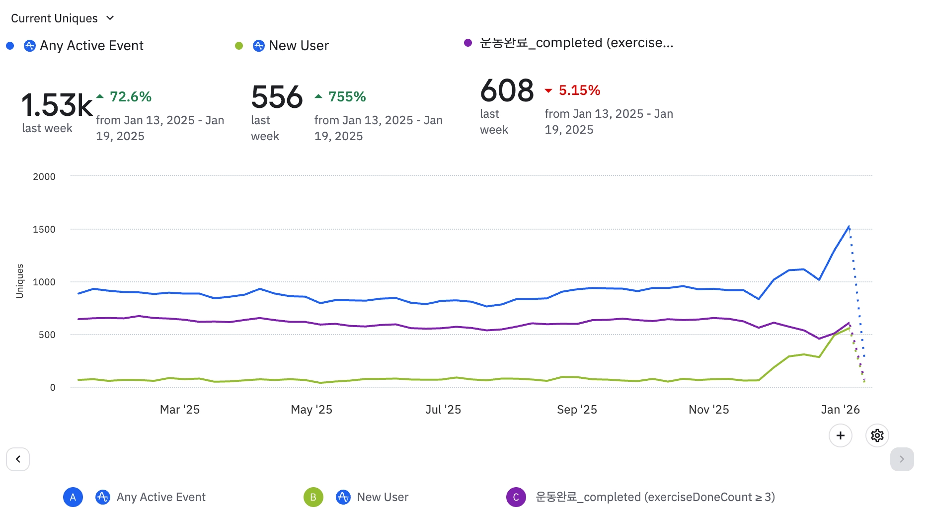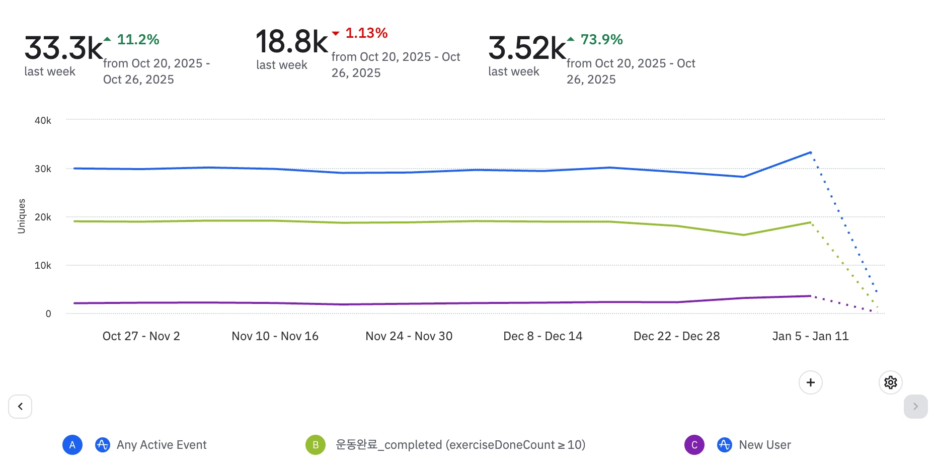 전반적으로 식단 기록 뷰 및 완료 이벤트 수가 증가하고 있는 추세이다.