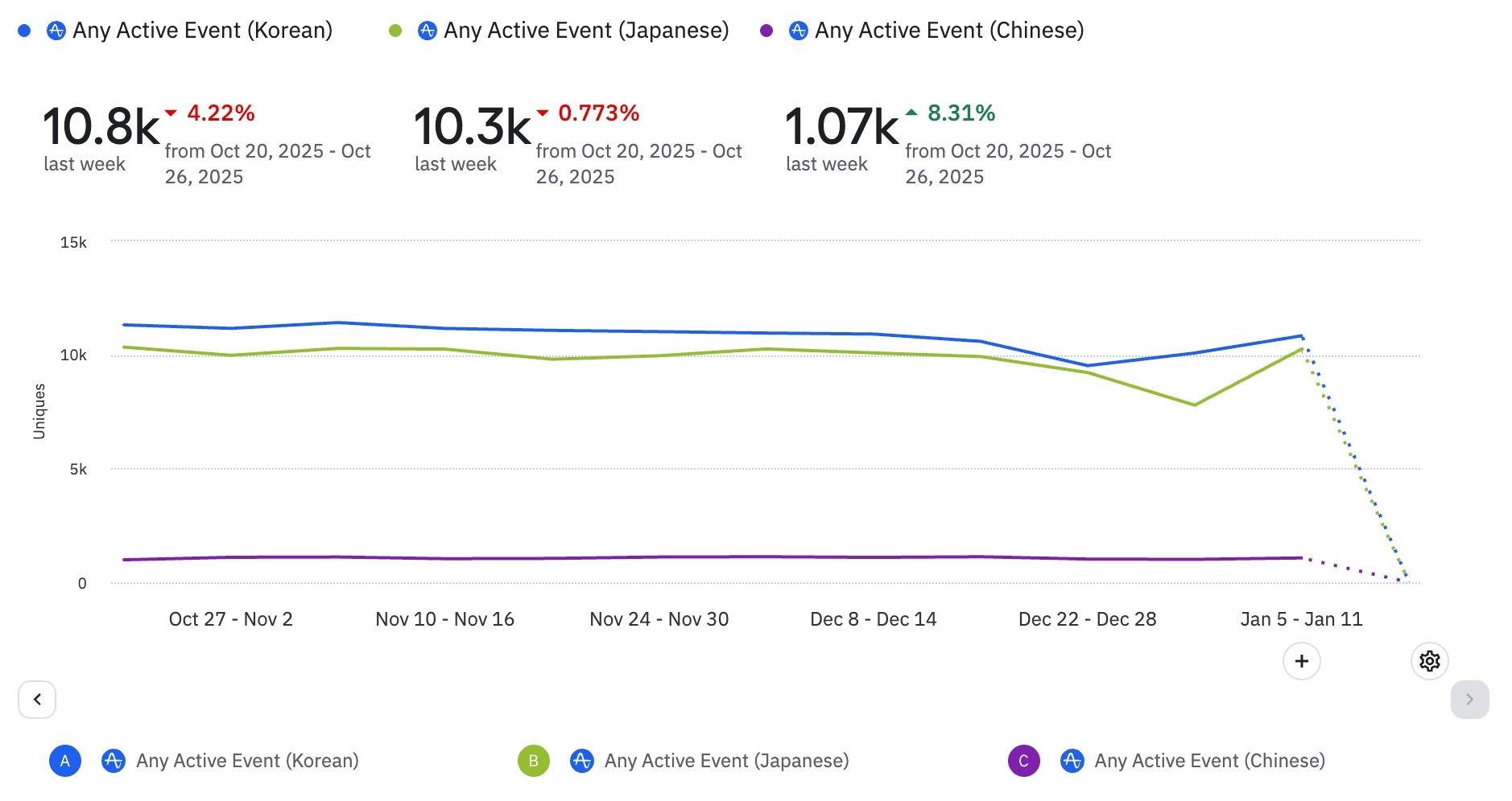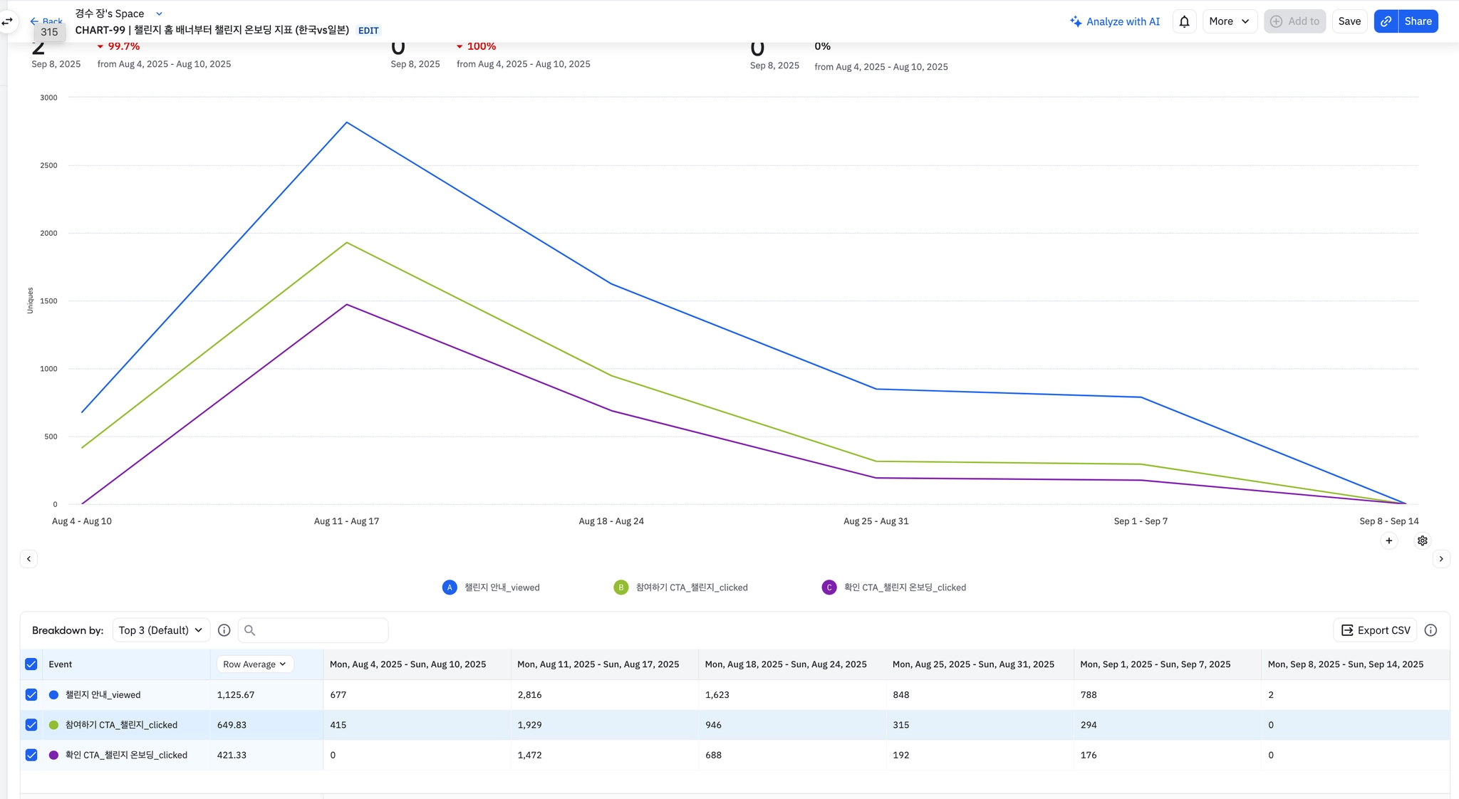 국가별로 한국 일본 모두 전주 대비 모든 이벤트 호출 수가 증가하였다.