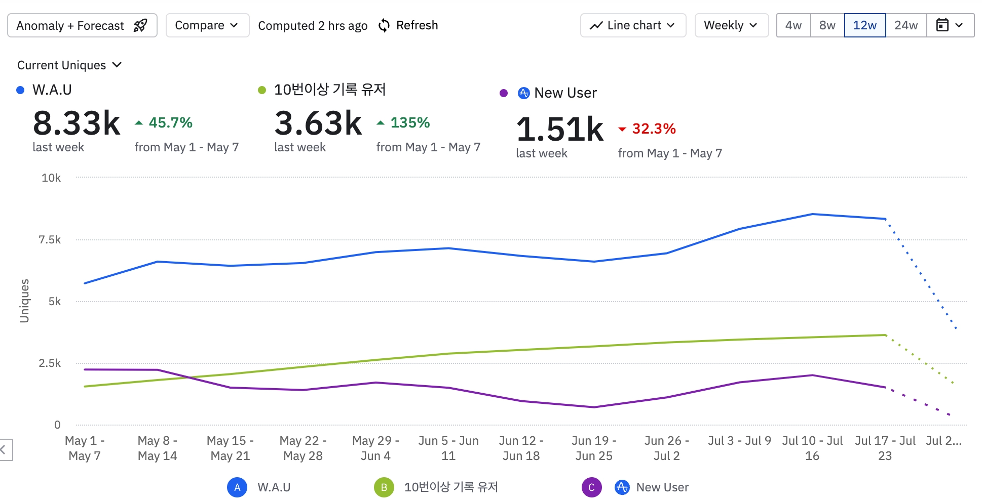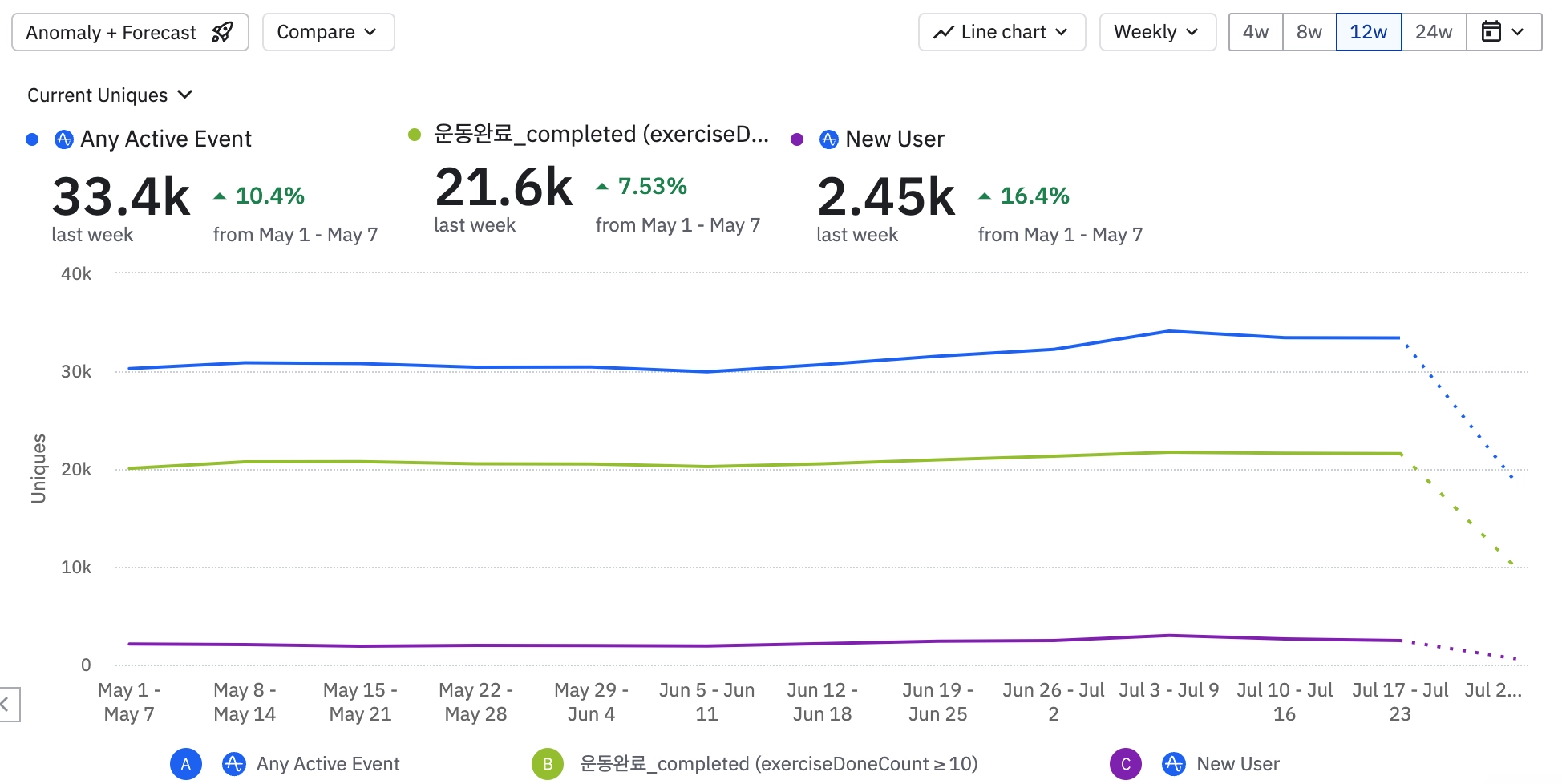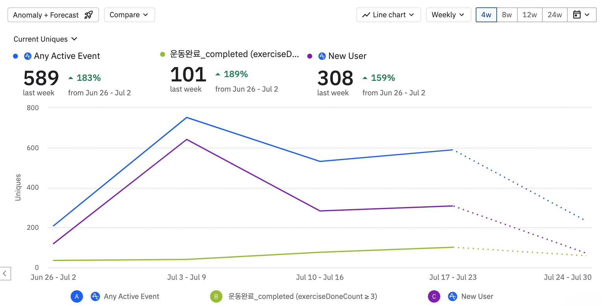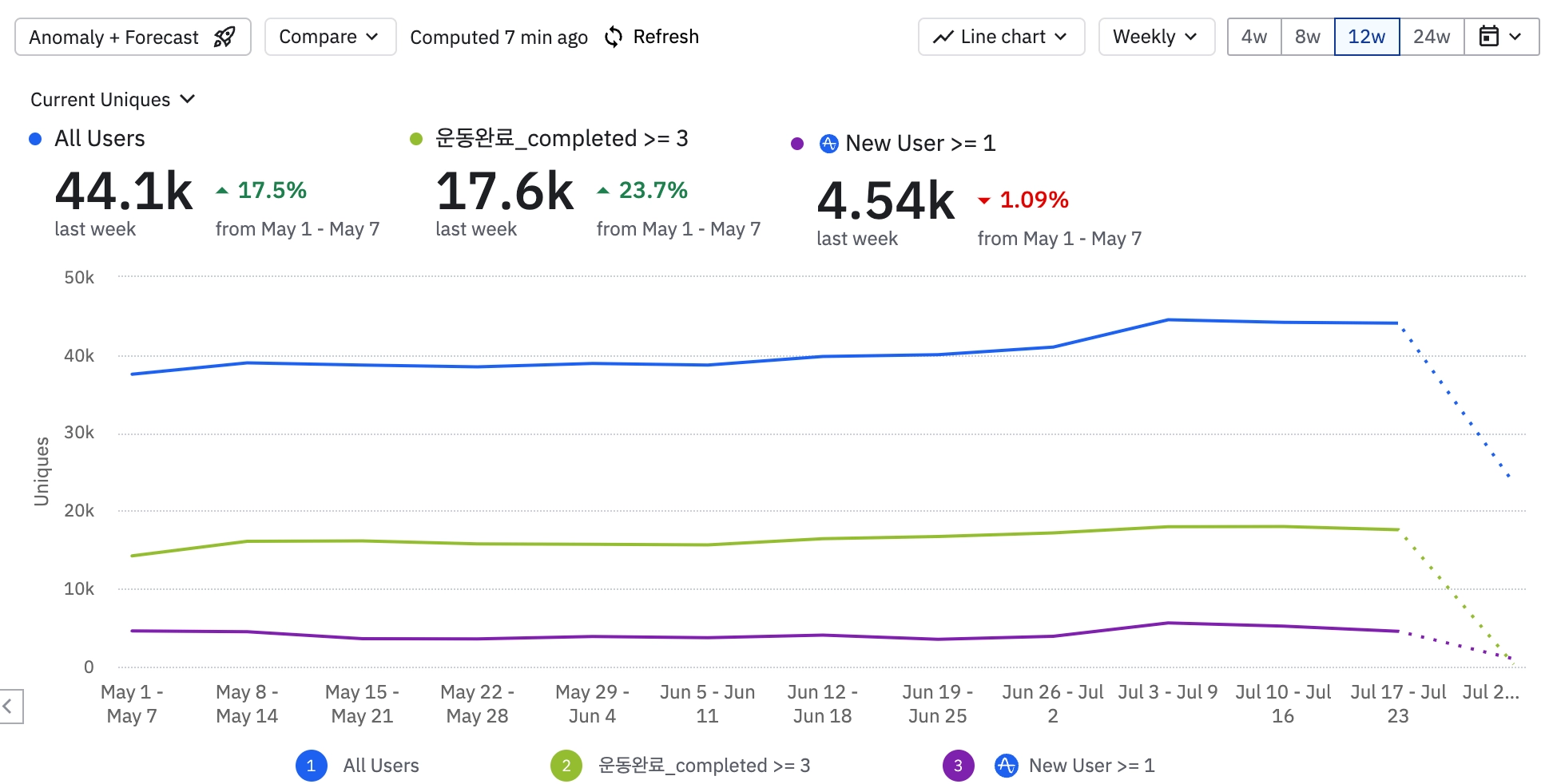 루틴 추천 시작율(unique) 45%: 신규 유저들 중 45%가 루틴 추천을 시작했다.
